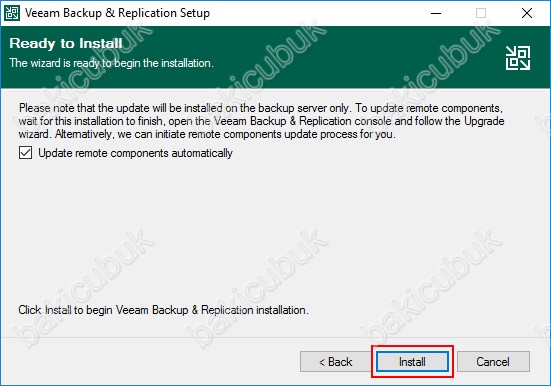 Ready to Install ekranın da Update remote components automatically ( Uzak bileşenleri otomatik olarak güncelleme ) seçeneği işaretliyoruz ve Install diyerek Veeam Backup & Replication 11a Upgrade ( Yükseltme ) işlemini başlatıyoruz.