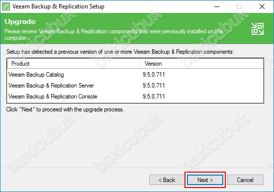 Upgrade ekranın da Veeam Catalog, Veeam Backup & Replication Server ve Veeam Backup & Replication Console versiyonlarını Veeam Backup & Replication 9.5.0.711 olarak görüyoruz ve Next diyerek devam ediyoruz.