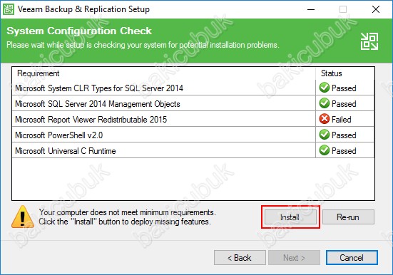 System Configuration Check ekranın da Veeam Backup & Replication 11a Upgrade ( Yükseltme ) işlemi için gerekli olan yazılımların Windows Server işletim sistemimiz üzerinde kurulması için Install diyoruz.