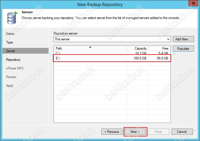 Sunucum üzerinde bulunan E:\200 GB boyutundaki diskimizi seçiyoruz Next diyerek devam ediyoruz.
