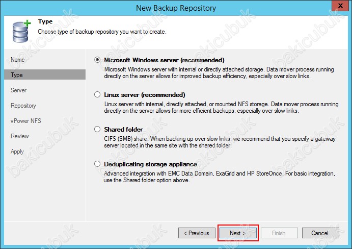 Type ekranında ise ekleyeceğimiz Backup Repository için dört farkli yapılandırmayi seçebiliriz.