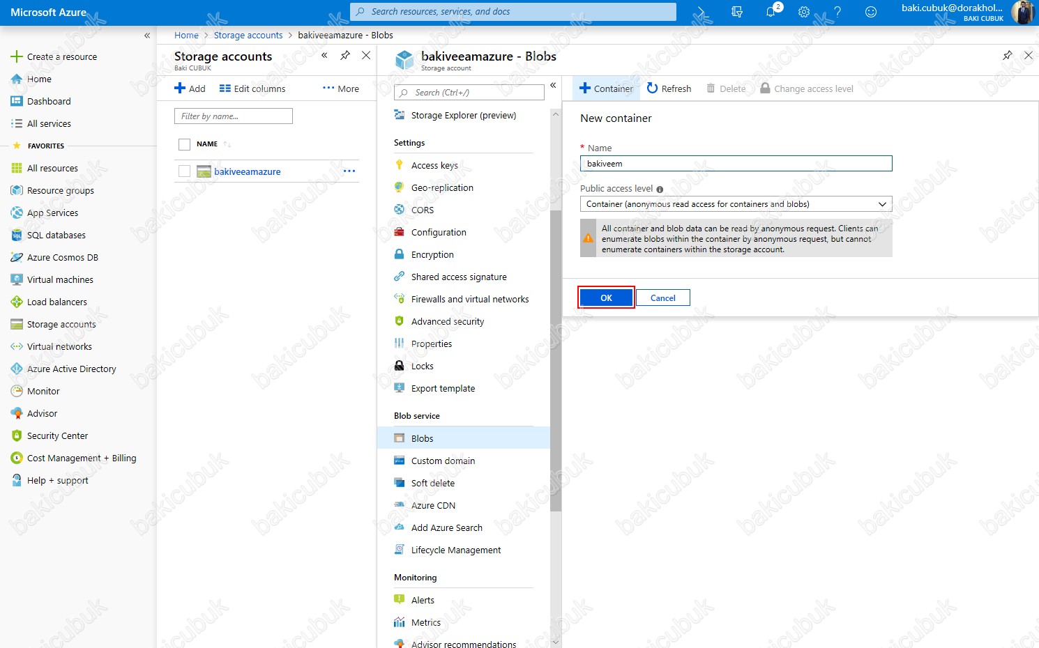 Public access level bölümünde Private (no anonymouns access),Blob (anonymouns read access for blobs only) ve Container (anonymouns read access for containers and blobs) seçenekleri bulunmaktadir.