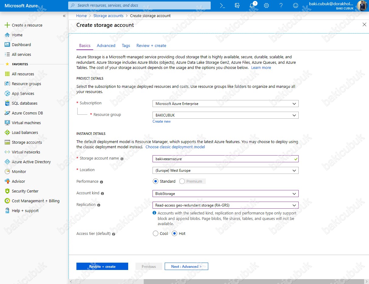 Basics ekranın da bulunan Access tier seçeneğinde normalde sağlanan Blob Storage hizmetine artık Hot Storage olarak adlandırılacak. Uzun süreli saklanması gereken, sürekli erişim gerektirmeyen verilerin ( yedekler, arşivler gibi ) saklandığı Blob Storage hizmetine ise artık Cool Storage adı verilmektedir.
