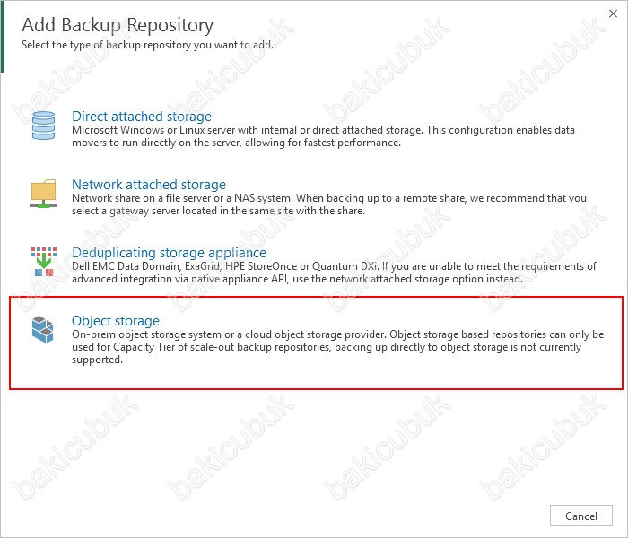 Object Storage : Amazon Web Services (AWS) Cloud ( Bulut ) hizmetinde içinde bulunan S3 (Simple Storage Service) Compatible ve Amazon S3, Microsoft Azure Blob Storage ve IBM CLoud Object Storage Cloud ( Bulut ) hizmetleri ürünler üzerinde Backup Repository yapılandırması için bu seçenek ile devam edebilirsiniz.