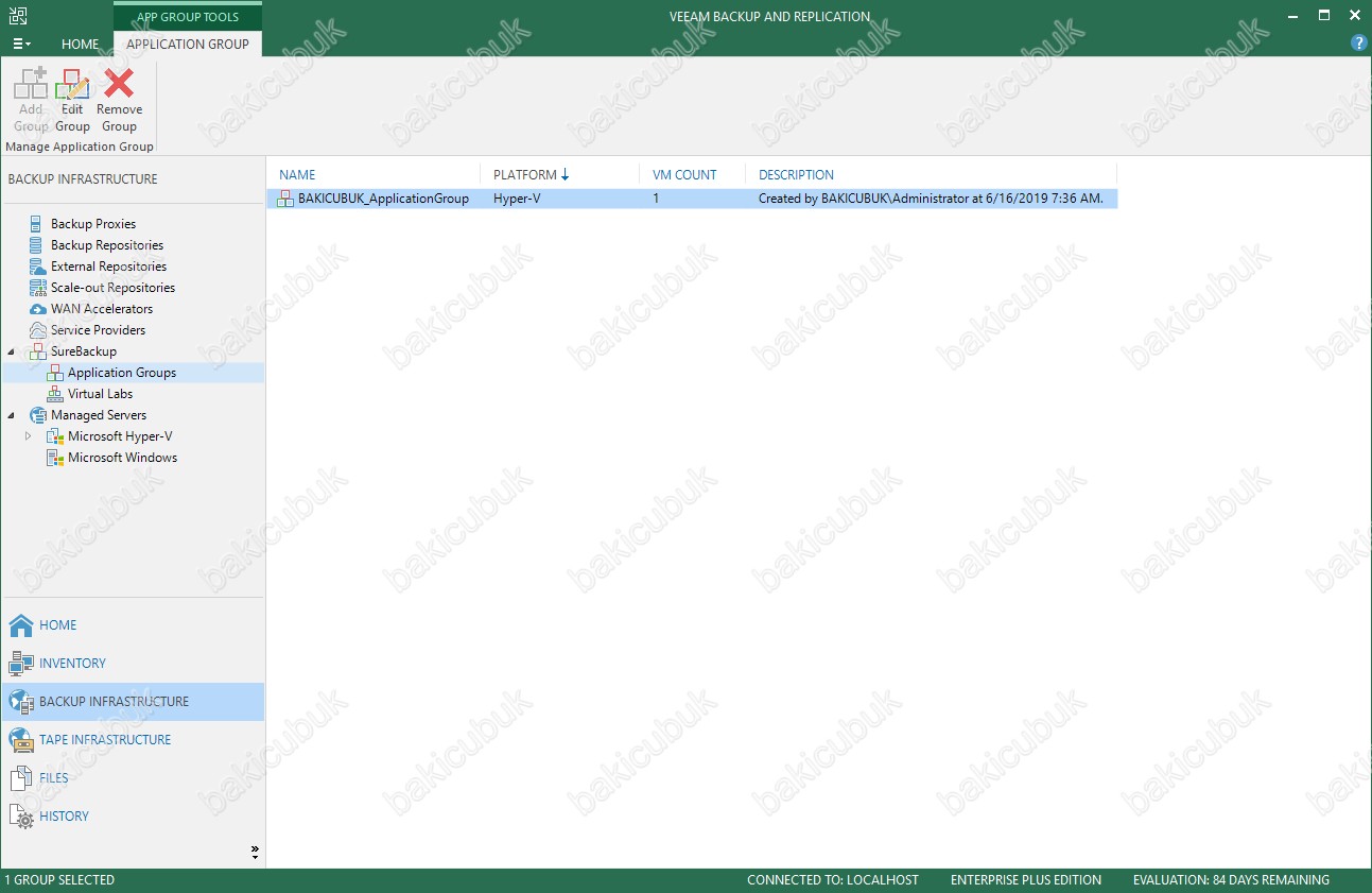 Veeam Backup & Replication v9.5 Update 4 konsolu üzerinde BACKUP INFRASTRUCTURE menüsü altında bulunan SureBackup menüsü altında bulunan Application Groups menüsü altına yapılandırmış olduğumuz BAKICUBUK_ApplicationGroup yapılandırmasının geldiğini görüyoruz.
