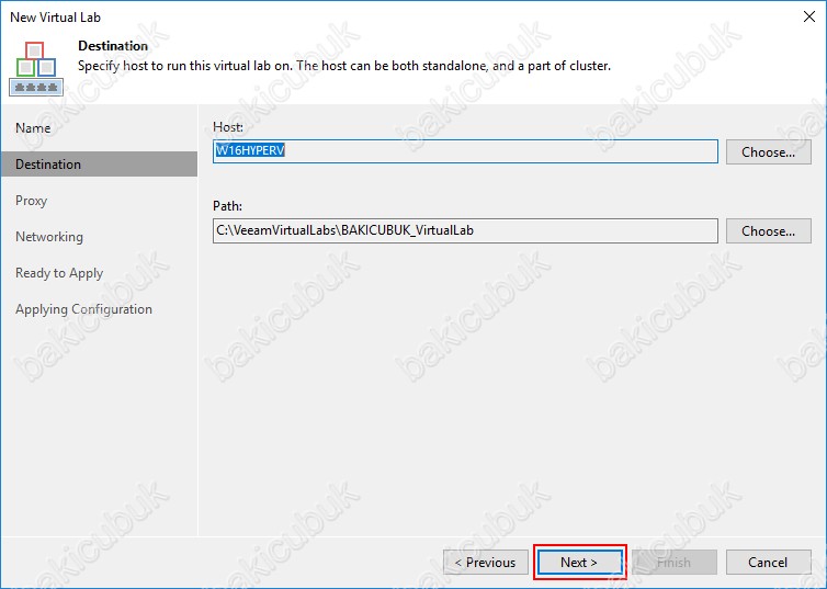 Destination ekranın da Host bölümünde hedef Microsoft Hyper-V ya da Microsoft Hyper-V Failover Cluster servisinin kurulu Host sunucumuz geliyor. Patch bölümünde Virtual Lab için dosyaların tutulacağı dizini görüyoruz. Destination ekranın da Hyper-V Host sunucumuzu yapılandırdıktan sonra Next diyerek devam ediyoruz.