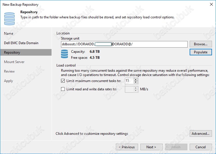 Limit maximum concurrent task to seçeneği ile oluşturacağınız backup repository üzerinde aynı anda kaç görevin çalışacağını belirliyoruz. Default olarak 15 şeklinde gelmektedir.