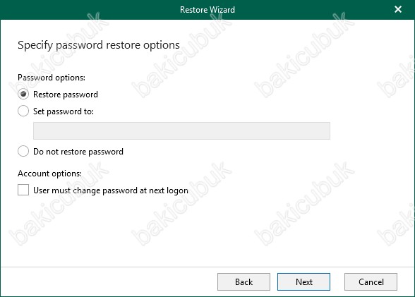 Specify password restore options ekranın da Password options seçeneği altında bulunan Do not restore password seçeneği ile Restore ( Geri Yükleme ) işleminden sonra belirleyebilirsiniz.