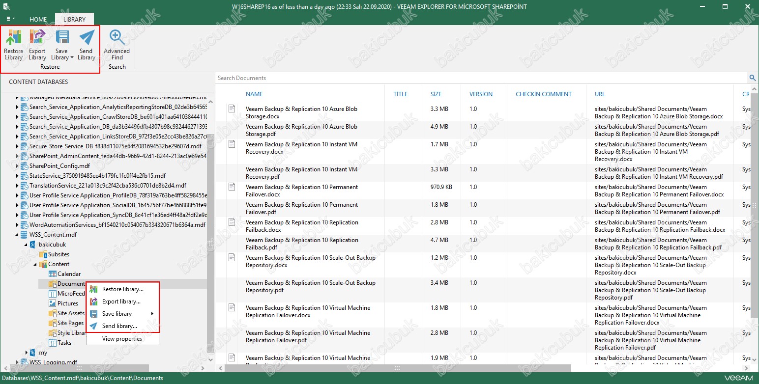 VEEAM EXPLORER FOR MICROSOFT SHAREPOINT konsulu üzerinde Databases altında WSS.Contect.mdf isimli Microsoft SharePoint Server Database dosyası altında Microsoft SharePoint Server üzerinde yapılandırmış olduğumuz bakicubuk isimli SharePoint Sitesini ve Content altında Documents üzerinde sağ tuş yaptığınız da Restore Library, Export Library, Save Library ve Send Library ya da Restore menüsünde Restore Library, Export Library, Save Library ve Send Library seçeneklerini görüyoruz.