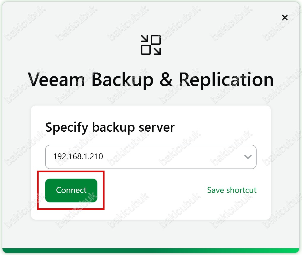 Veeam Backup & Replication ekranında Specify backup server bölümüne bağlanmak istediğimiz Veeam Software Appliance 13.0.0.4967 kurulumunda yapılandırmış olduğumuz sunucumuzun Statik IP Adresini ya da Sunucu Adını yazıyoruz ve Connect diyerek bağlanıyoruz.