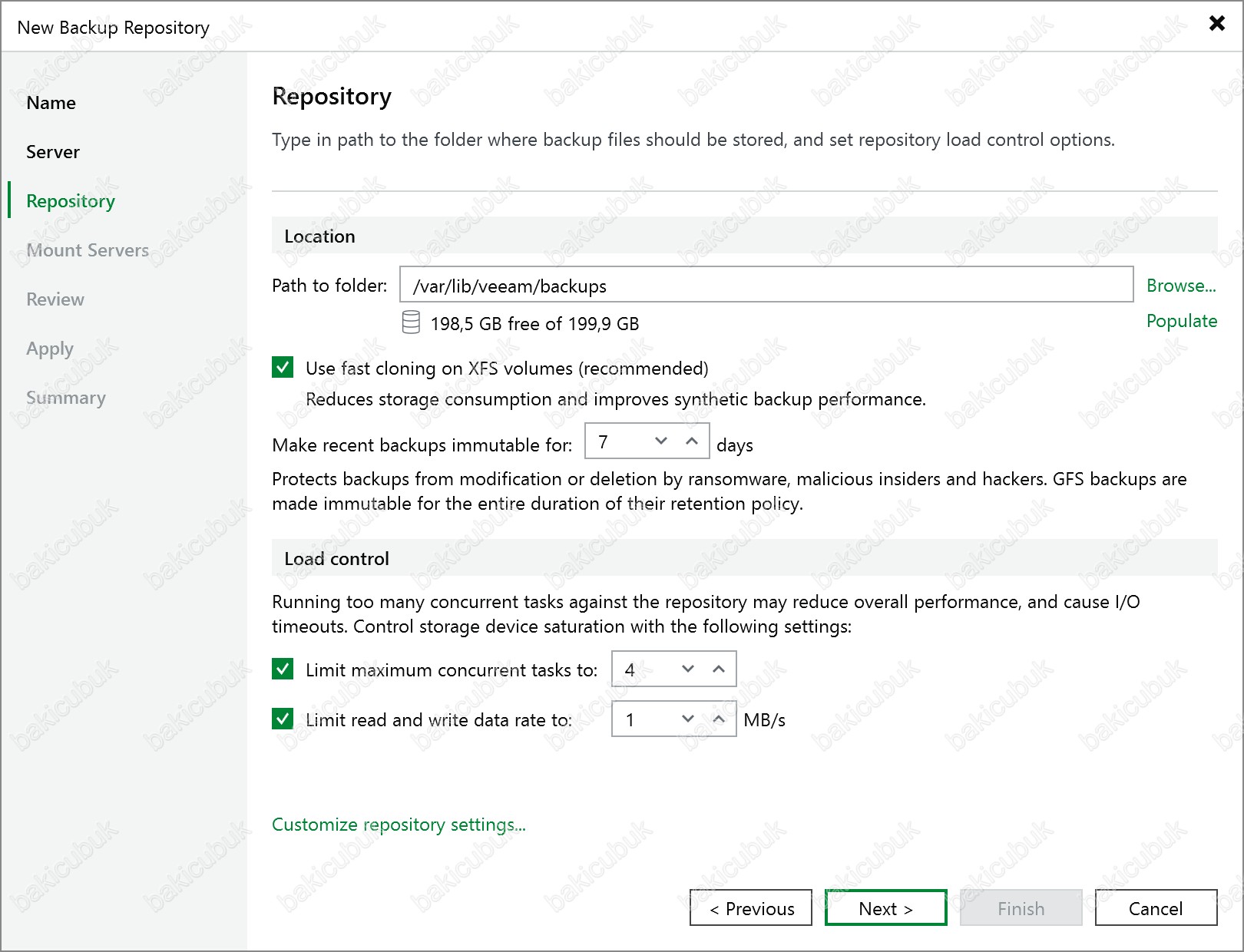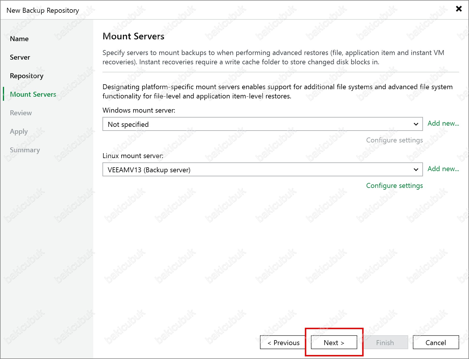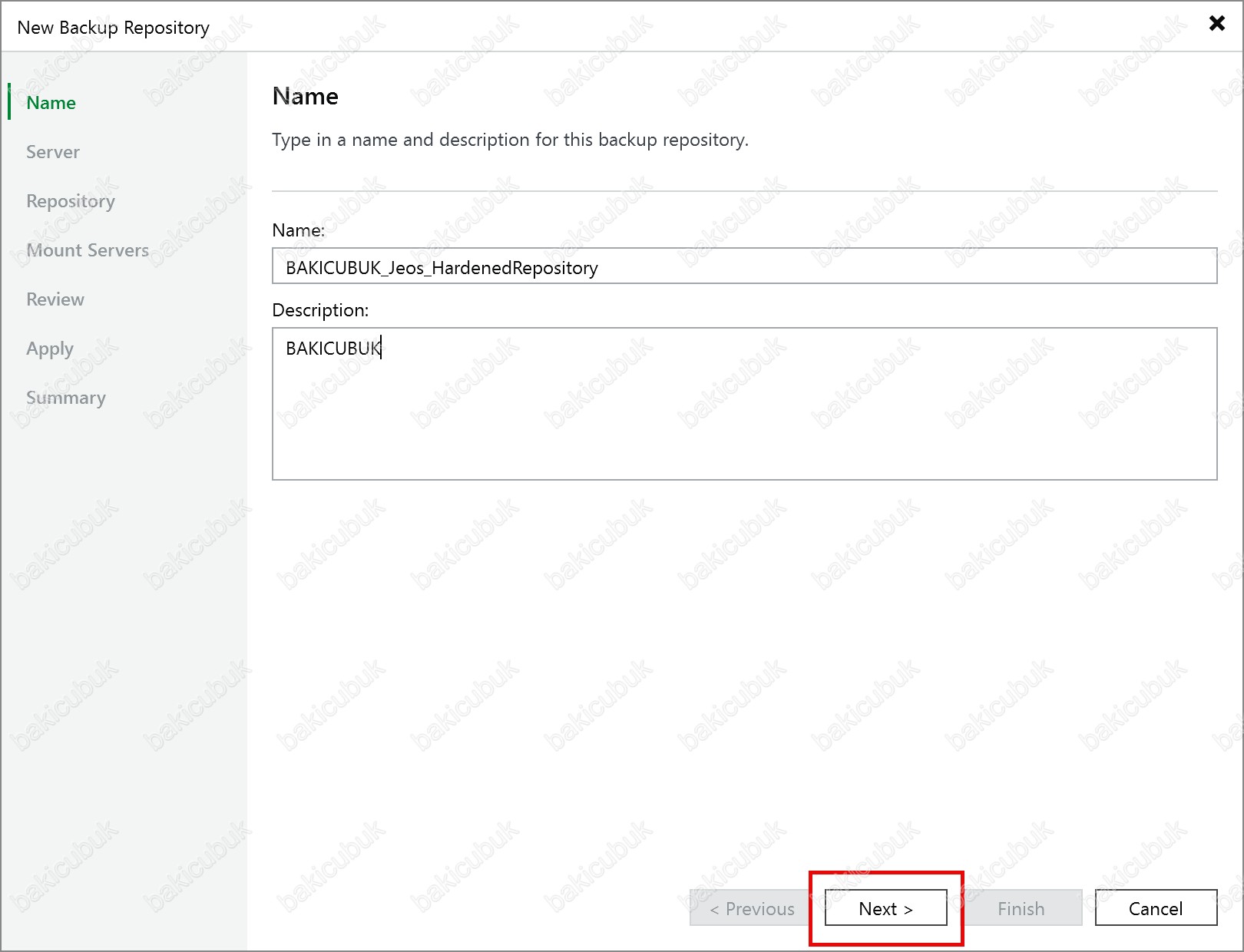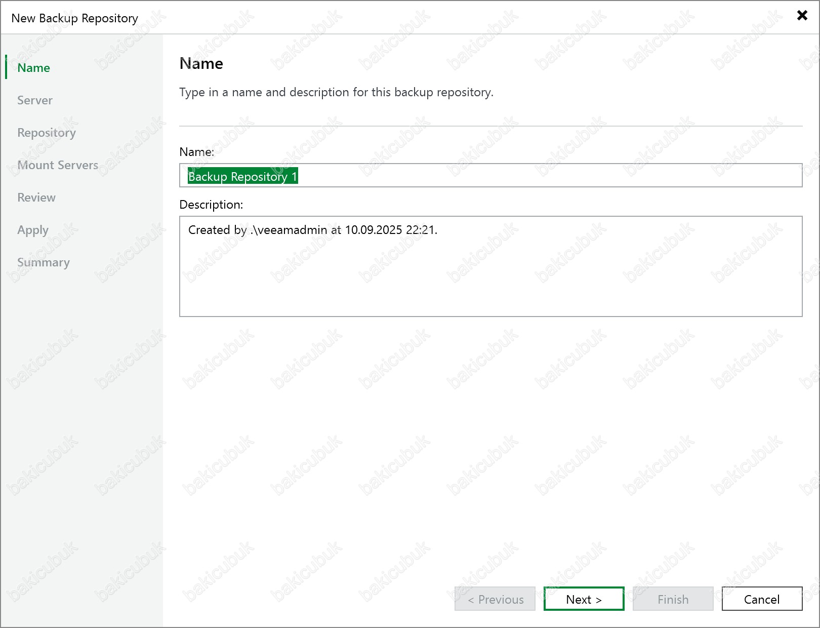 Change the configuration backup location to the newly created repository: Bu seçenek işaretlendiğinde, Veeam Backup & Replication kendi konfigürasyon yedeğini (Configuration Backup) varsayılan depodan alır ve yeni oluşturulan repository’ye kaydeder. Konfigürasyon yedeği; job ayarları, depolar, proxy’ler, kullanıcı hakları gibi tüm altyapı yapılandırmasını içerir. Böylece herhangi bir arıza, migration veya yeni kurulum durumunda, bu backup kullanılarak Veeam ortamı hızlıca eski haline getirilebilir.