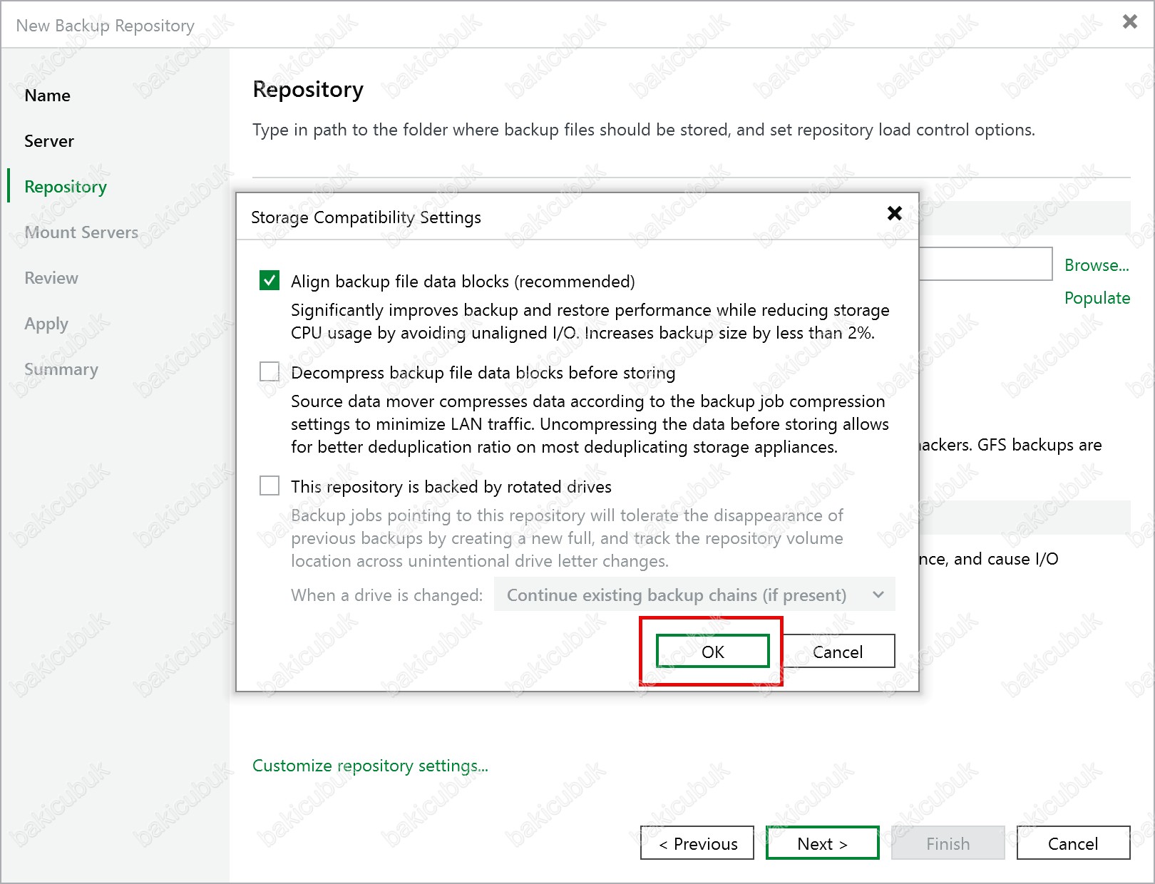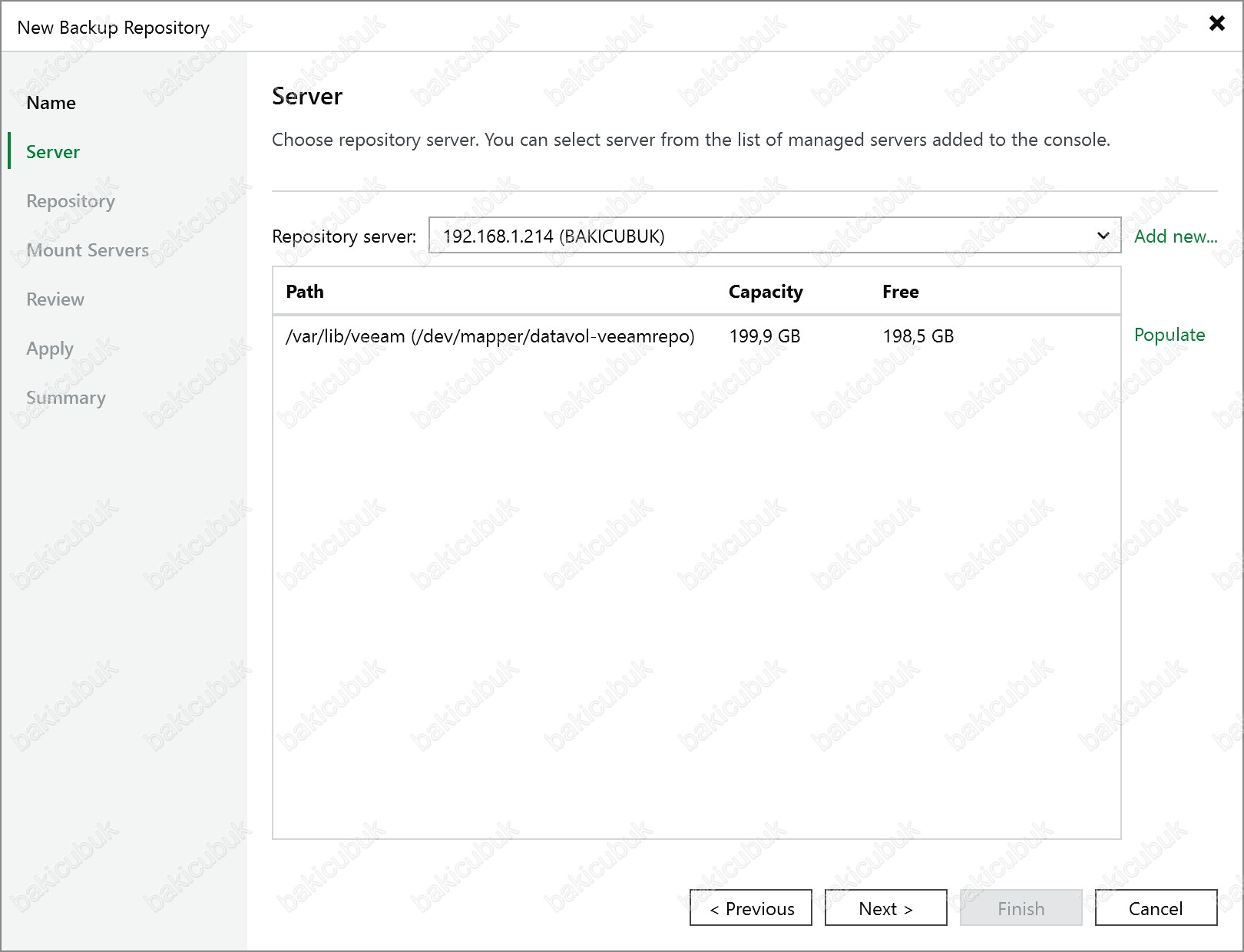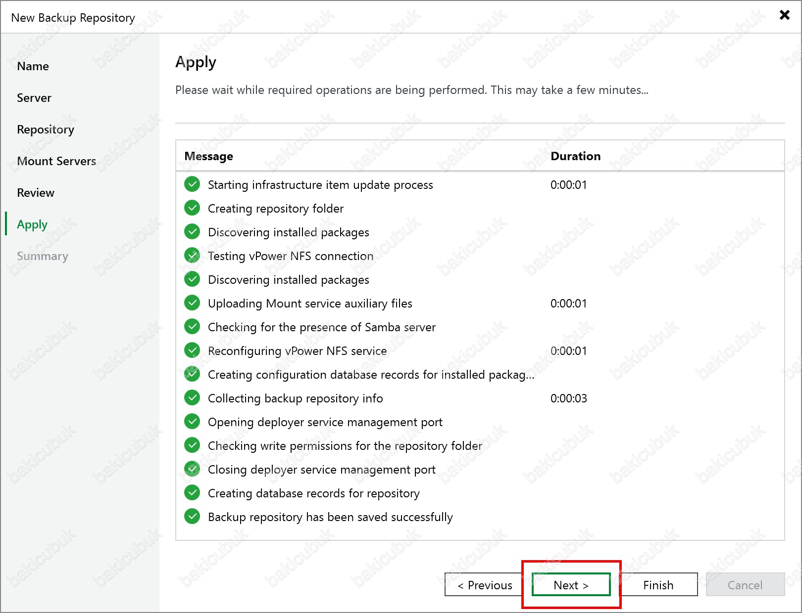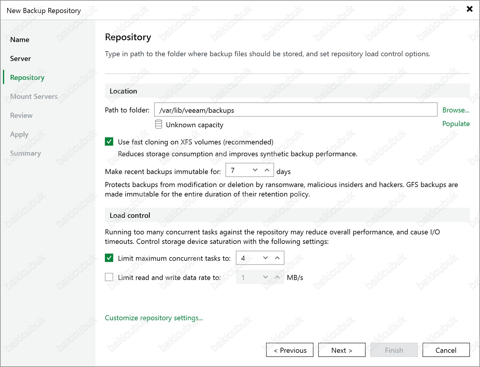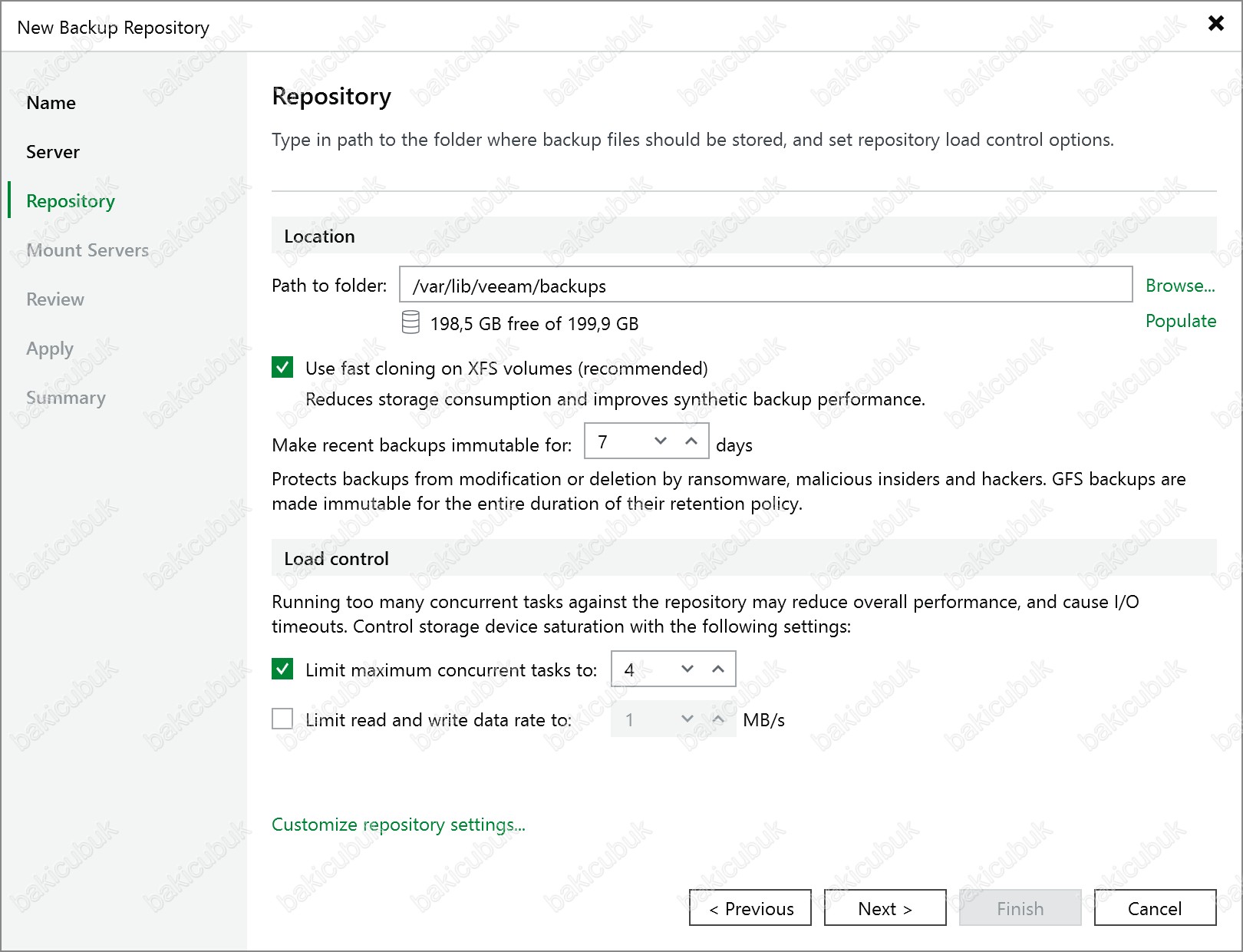 Change the configuration backup location to the newly created repository: Bu seçenek işaretlendiğinde, Veeam Backup & Replication kendi konfigürasyon yedeğini (Configuration Backup) varsayılan depodan alır ve yeni oluşturulan repository’ye kaydeder. Konfigürasyon yedeği; job ayarları, depolar, proxy’ler, kullanıcı hakları gibi tüm altyapı yapılandırmasını içerir. Böylece herhangi bir arıza, migration veya yeni kurulum durumunda, bu backup kullanılarak Veeam ortamı hızlıca eski haline getirilebilir.