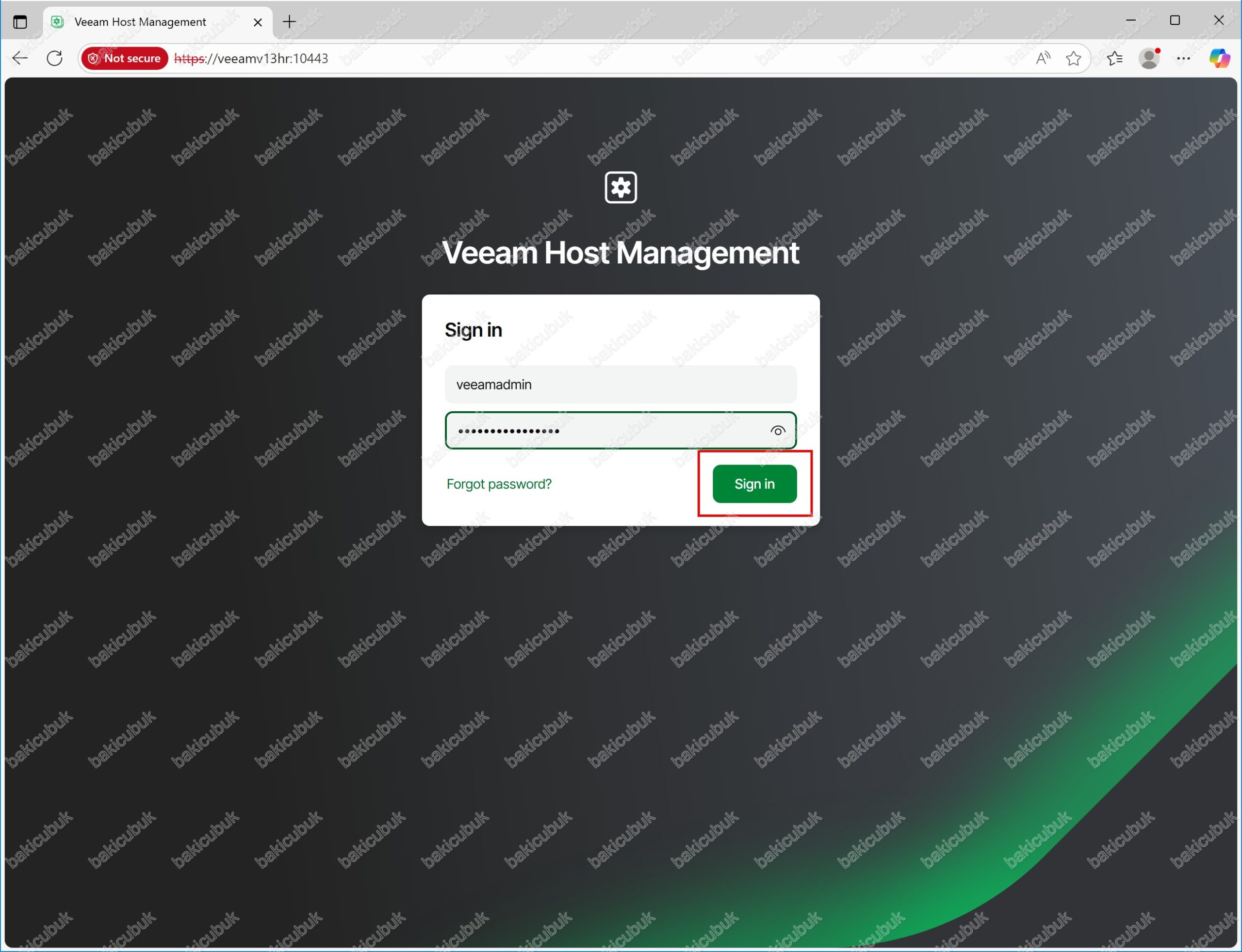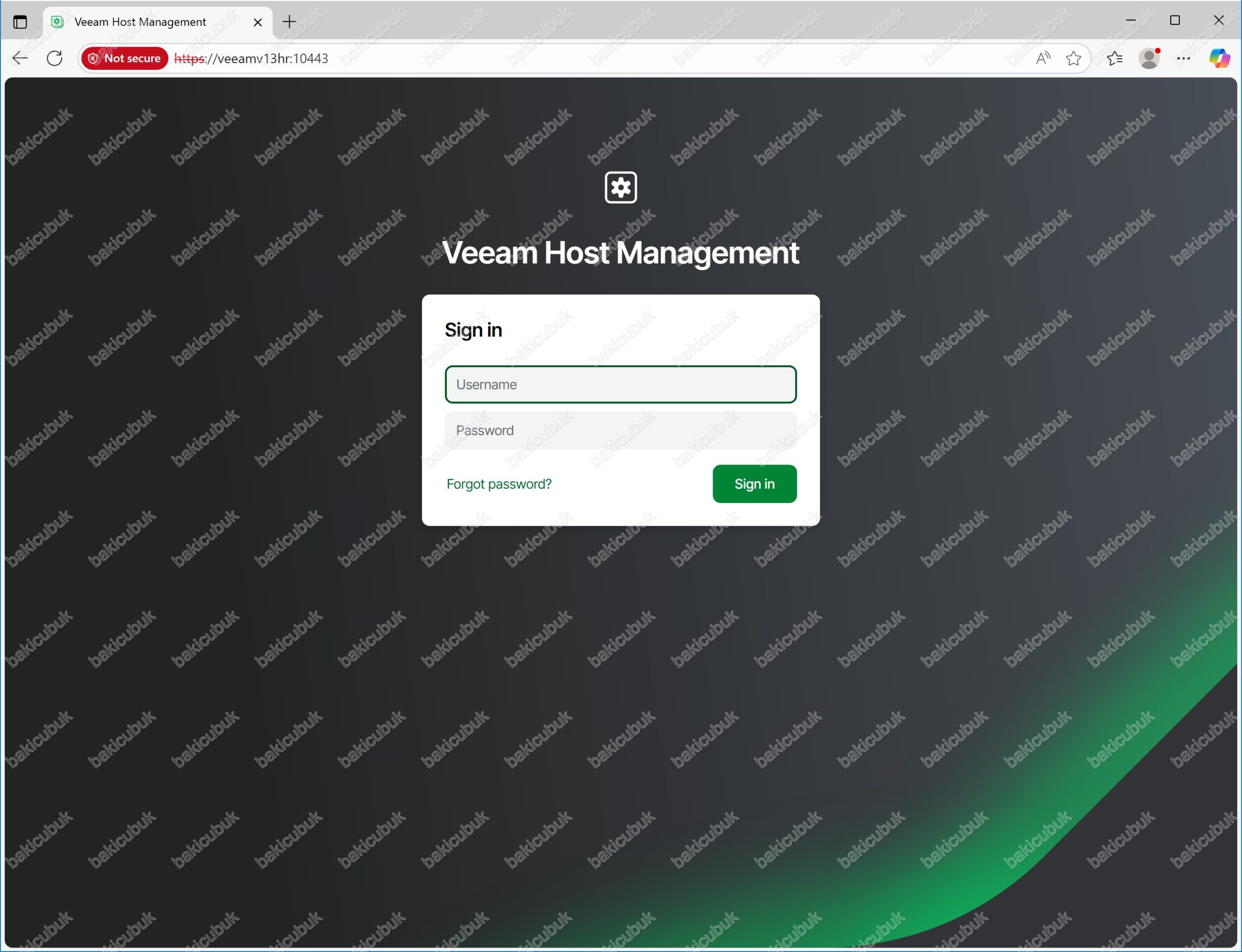 Veeam Host Management Console ekranında Sing in adımında Username (Kullanıcı adı) ve Password (Parola) bölümlerine Veeam JEOS 13.0.0.4967 Hardened Repository kurulumu ve yapılandırmasında yapılandırmış olduğumuz veeamadmin isimli Host Admin (Sunucu Yöneticisi) hesabının bilgilerini giriyoruz ve Sign in seçeneği ile giriş yapıyoruz.