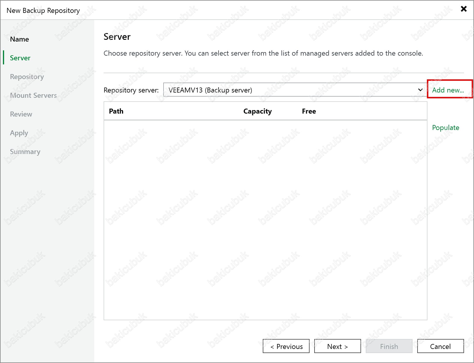 Server ekranında Repository server bölümünde VEEAMV13HR isimli 192.168.1.214 IP Adresine sahip Veeam JEOS 13.0.0.4967 Hardened Repository sunucumuzu eklemek ve yapılandırmak için Add new seçeneğine tıklıyoruz.