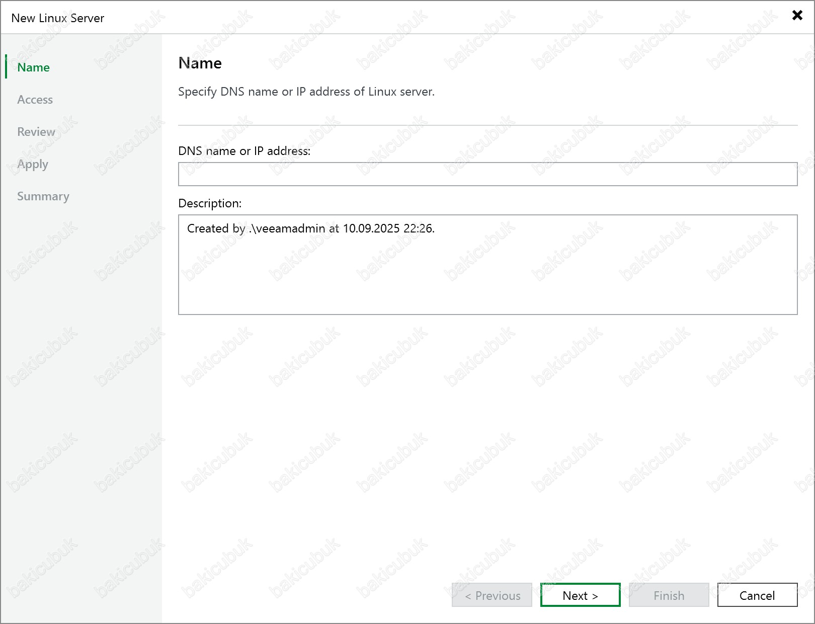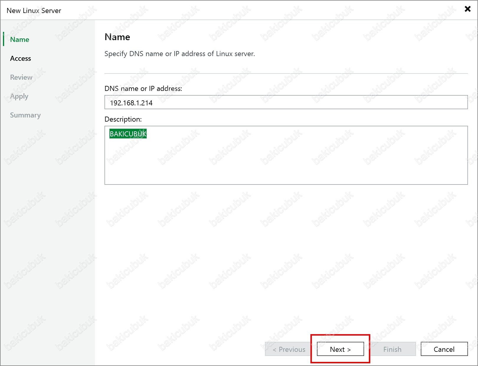 Name ekranında DNS name or IP address bölümüne Veeam Software Appliance 13.0.0.4967 üzerine ekleyeceğimiz Veeam JEOS 13.0.0.4967 Hardened Repository sunucumuzun DNS Name (Domain Name Server İsmi) ya da IP address (IP Adresi) bilgisini yazmamız gerekiyor. Burada Veeam JEOS 13.0.0.4967 Hardened Repository sunucumuzun IP address (IP Adresi) bilgisi ile devam edilmesi gerekmektedir. Yoksa bağlantıda sorun yaşayabilirsiniz.