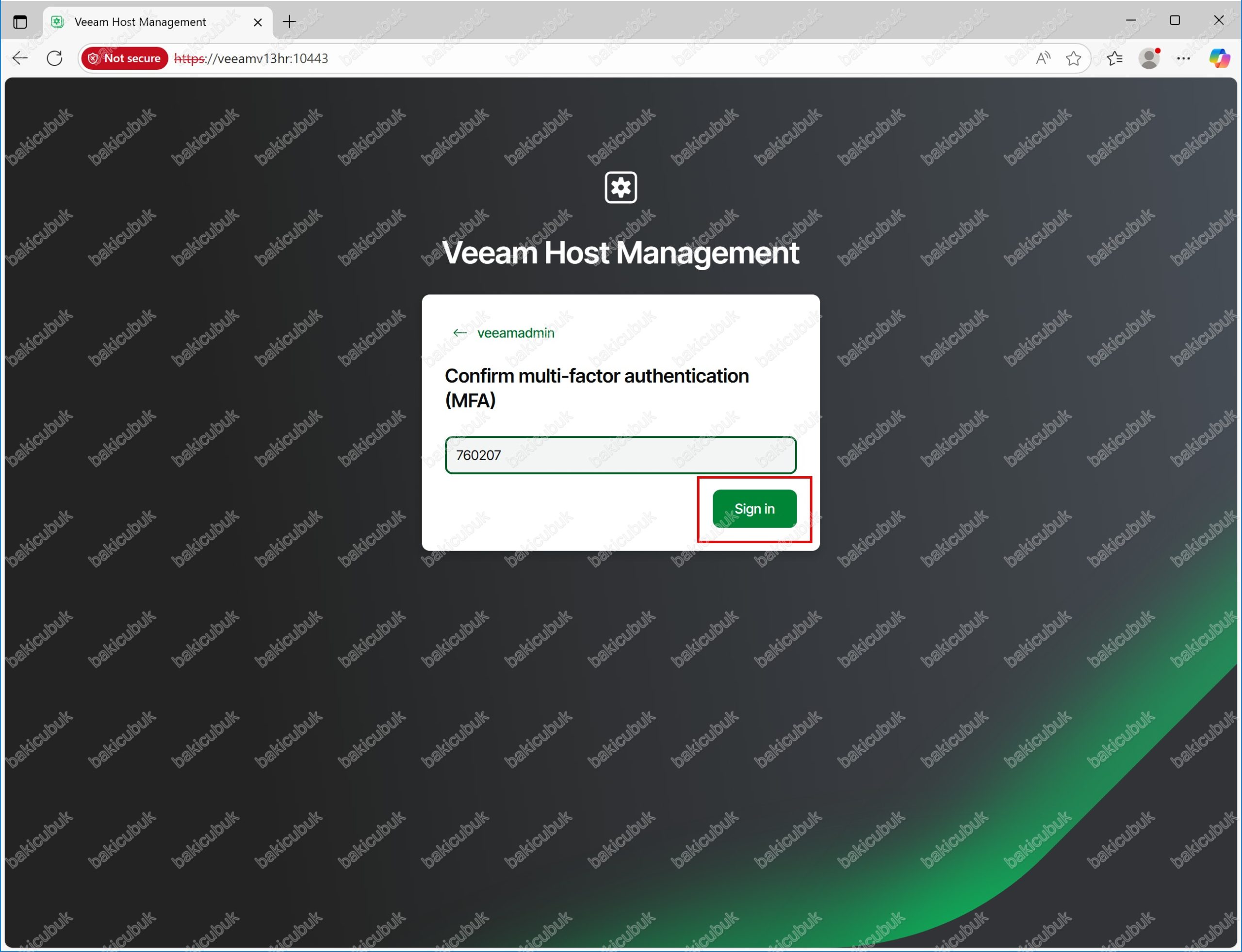Veeam Host Management Console ekranında Confirm multi-factor authentication (MFA) admında bölümüne cep telefonunuz üzerinde yapılandırmış olduğumuz MFA (Multi-Factor Authentication) mobil uygulaması (Google Authenticator veya Microsoft Authenticator) bulunan kodu giriyoruz ve Sign in seçeneği ile giriş yapıyoruz.