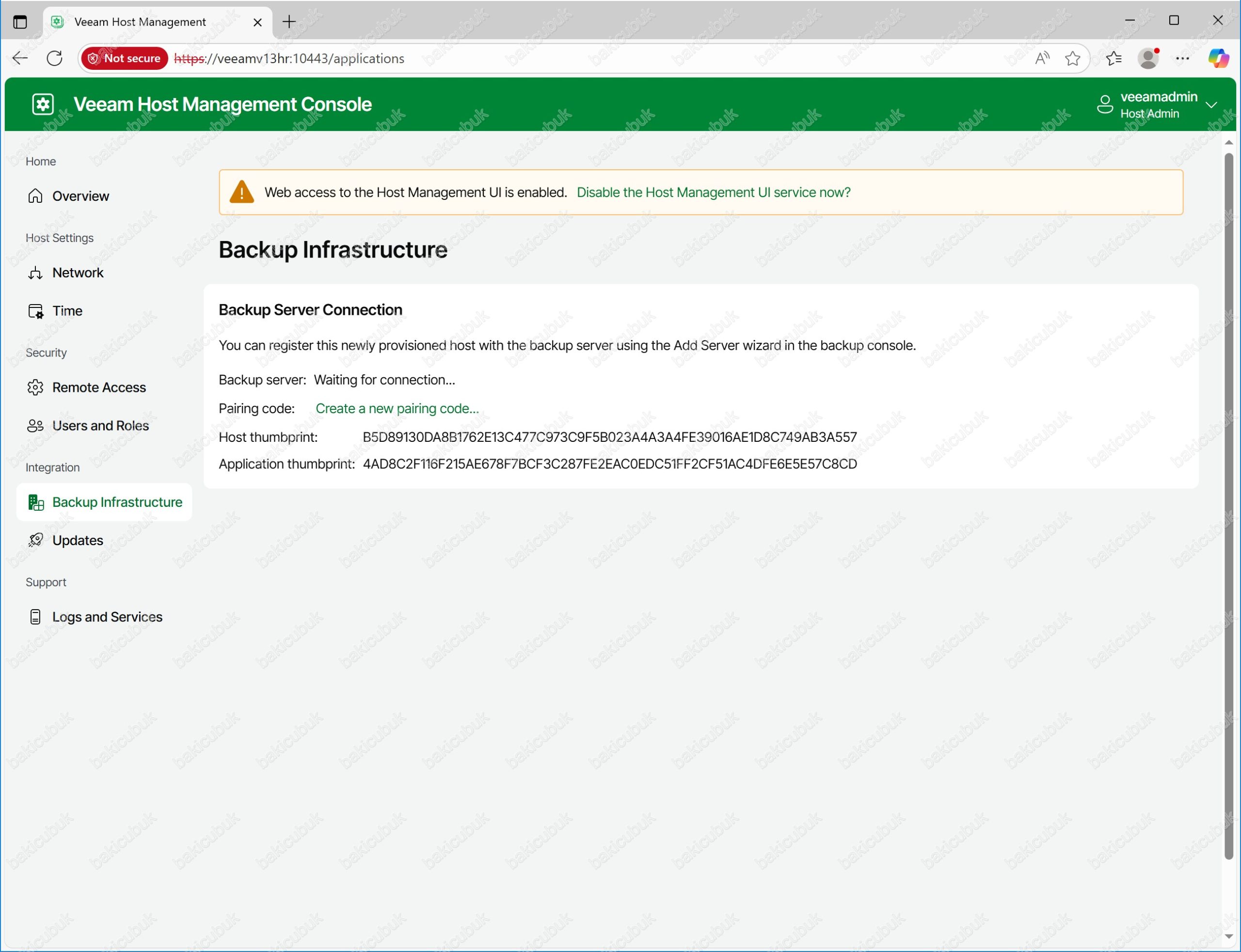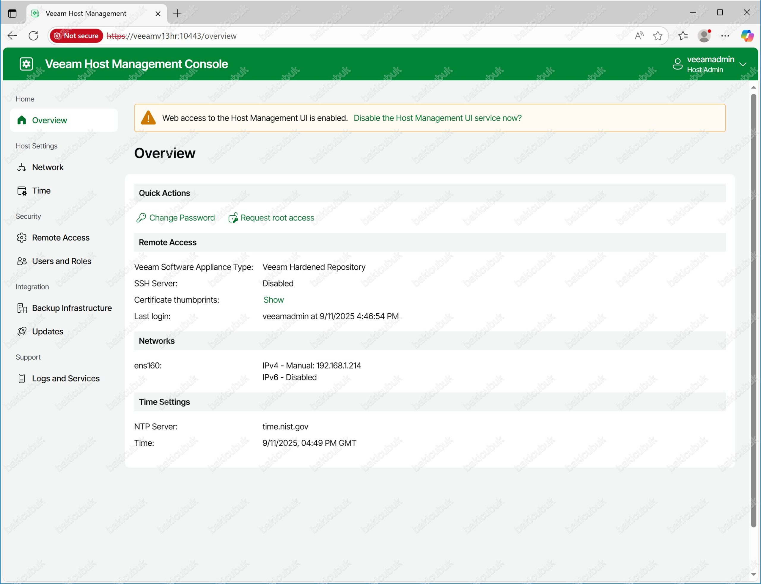 Web access to the Host Management UI is enabled. Disable the Host Management UI service now? uyarını görüyoruz. Veeam JEOS 13.0.0.4967 Hardened Repository sunucunuz üzerinde Veeam Host Management Web UI yönetim konsolunun Enable (Etkinleştir) durumunda olduğunu ve bunu Disable (Devre Dışı) duruma getirilebileceğini görüyoruz. Veeam’in özellikle Hardened (immutable) Linux Repository’lerinde Veeam Host Management Web UI yönetim konsolu, sadece ihtiyaç anında erişimi açılmalıdır. Veeam Host Management Web UI yönetim konsolu sürekl olarak açık bırakılması güvenlik nedeniyle kesinlikle önerilmemektedir.