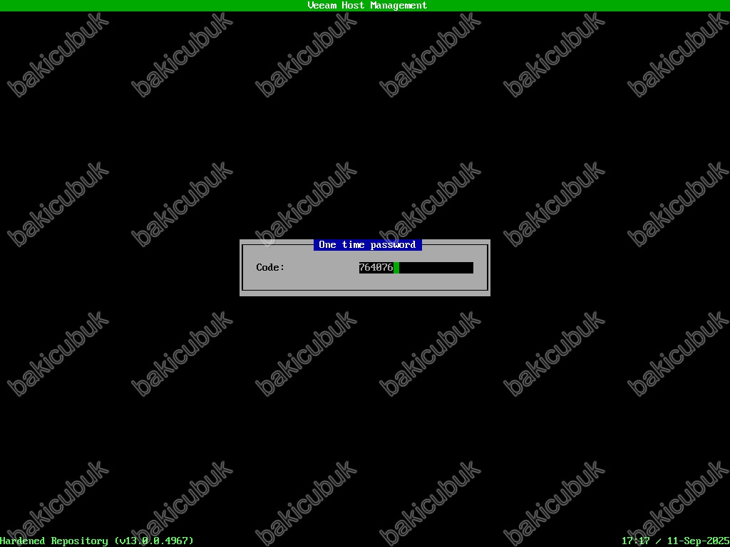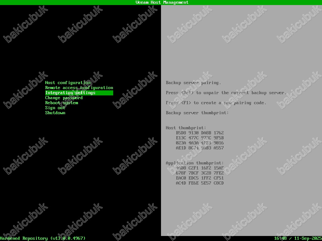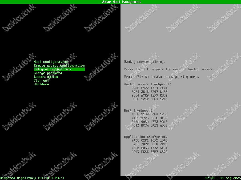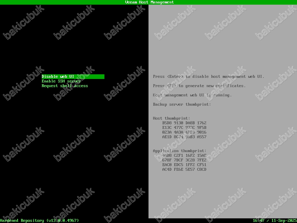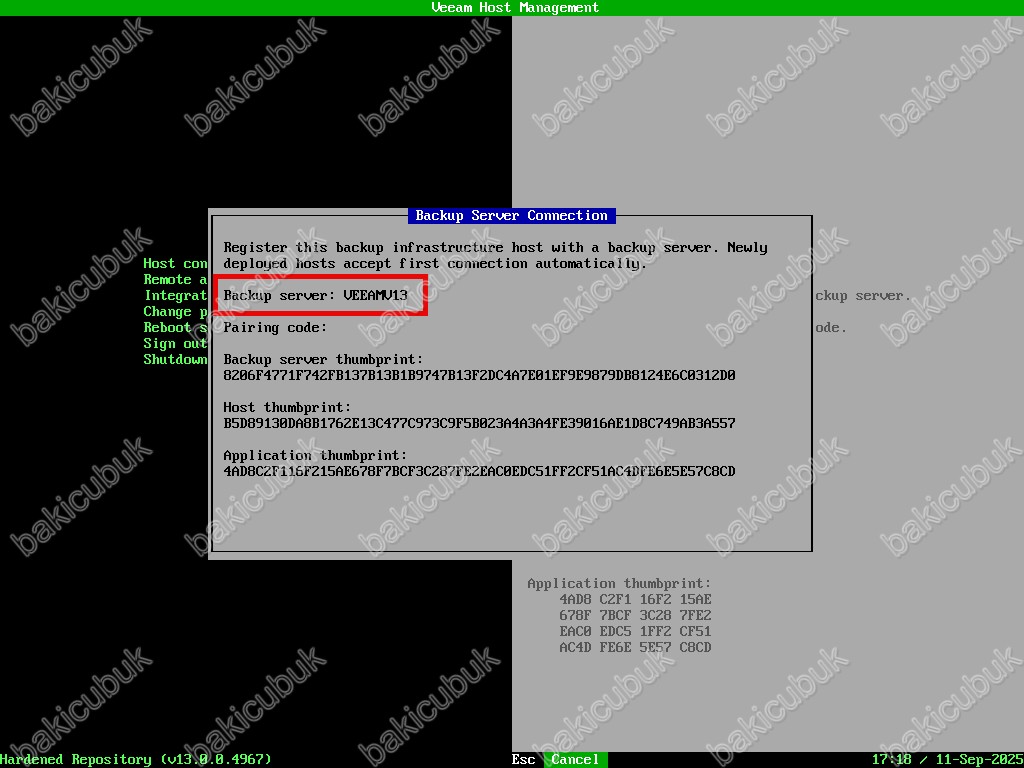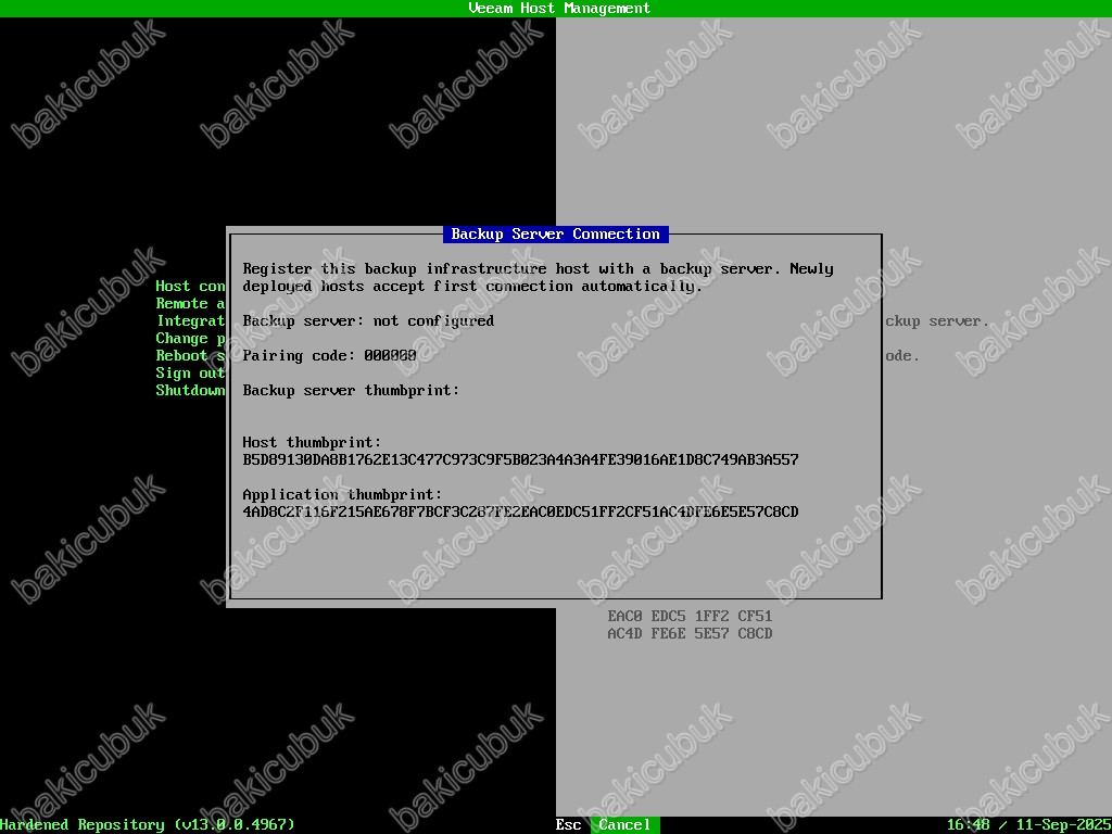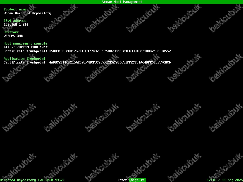 - Host thumbprint: Veeam JEOS 13.0.0.4967 Hardened Repository sunucumuzun bağlantı sağladığı SSL/TLS sertifikasının benzersiz hash değeridir.