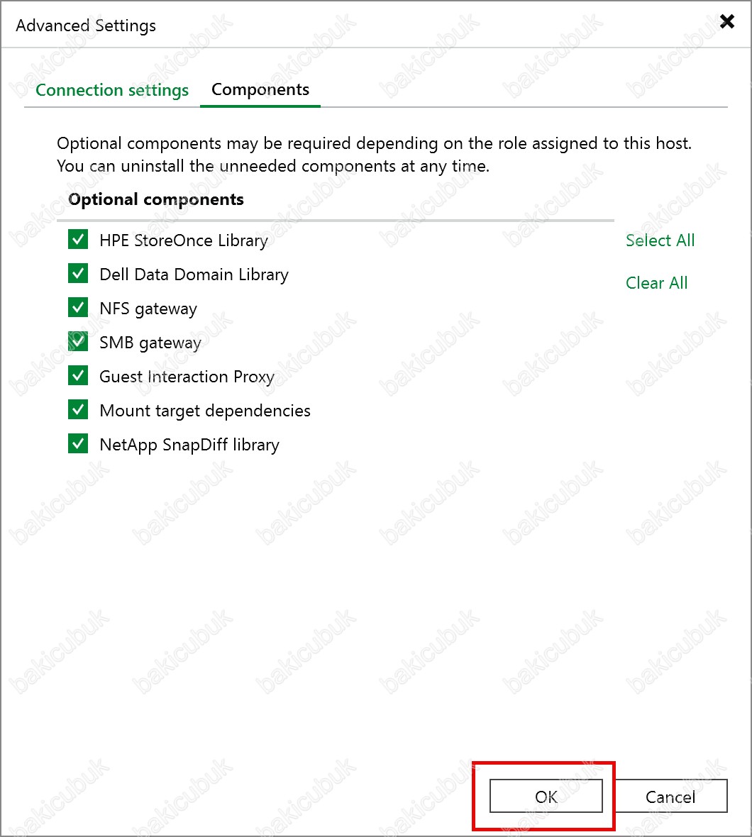 Advanced Settings ekranında Components sekmesinde Optional components bölümü altında Veeam Software Appliance 13.0.0.4967 üzerine ekleyeceğimiz Veeam JEOS 13.0.0.4967 Hardened Repository sunucumuza kurulacak olan bileşenlerini görüyoruz. Optional components bölümü altında bulunan Component (Bileşenlerle) kurulumları opsiyoneldir. Hangilerinin kurulup hangilerinin kurulmayacağına siz karar verebilirsiniz.