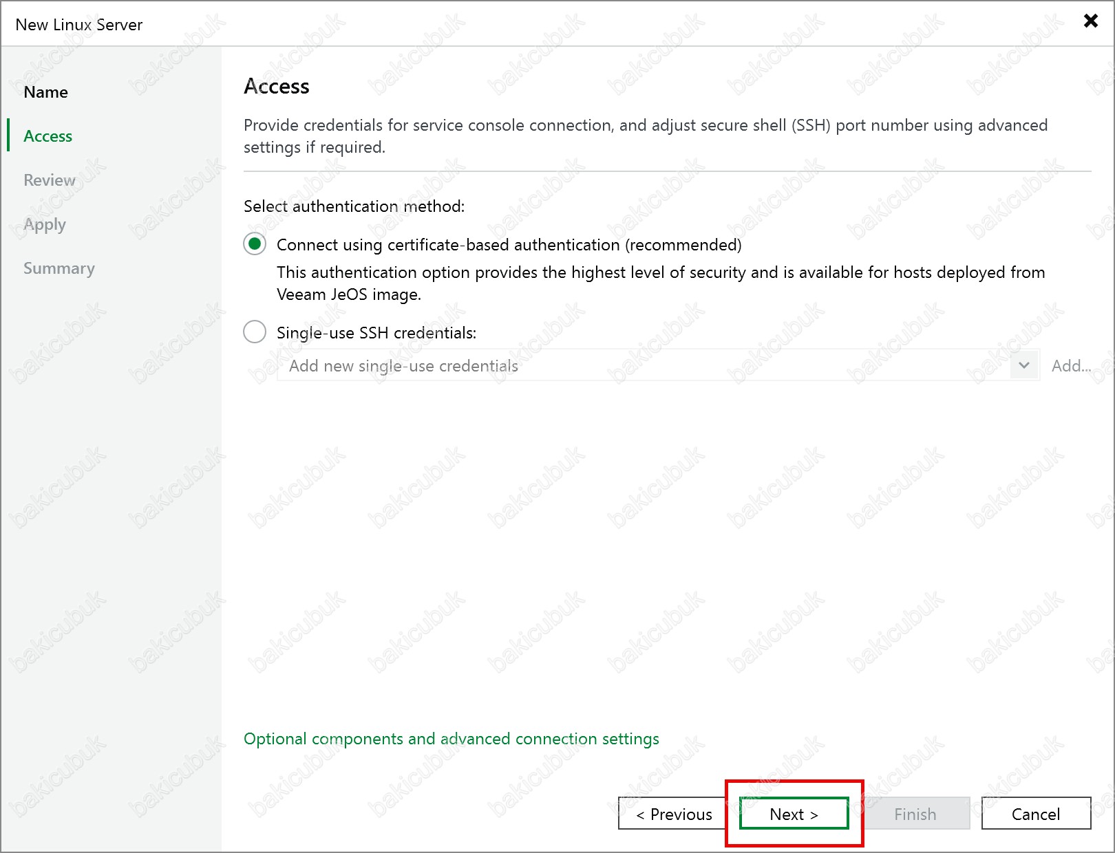 Access ekranında Select authentication methed bölümü altında bulunan Connect using certificate-based authentication (recommended) seçeneğini seçiyoruz ve Next diyerek devam ediyoruz.
