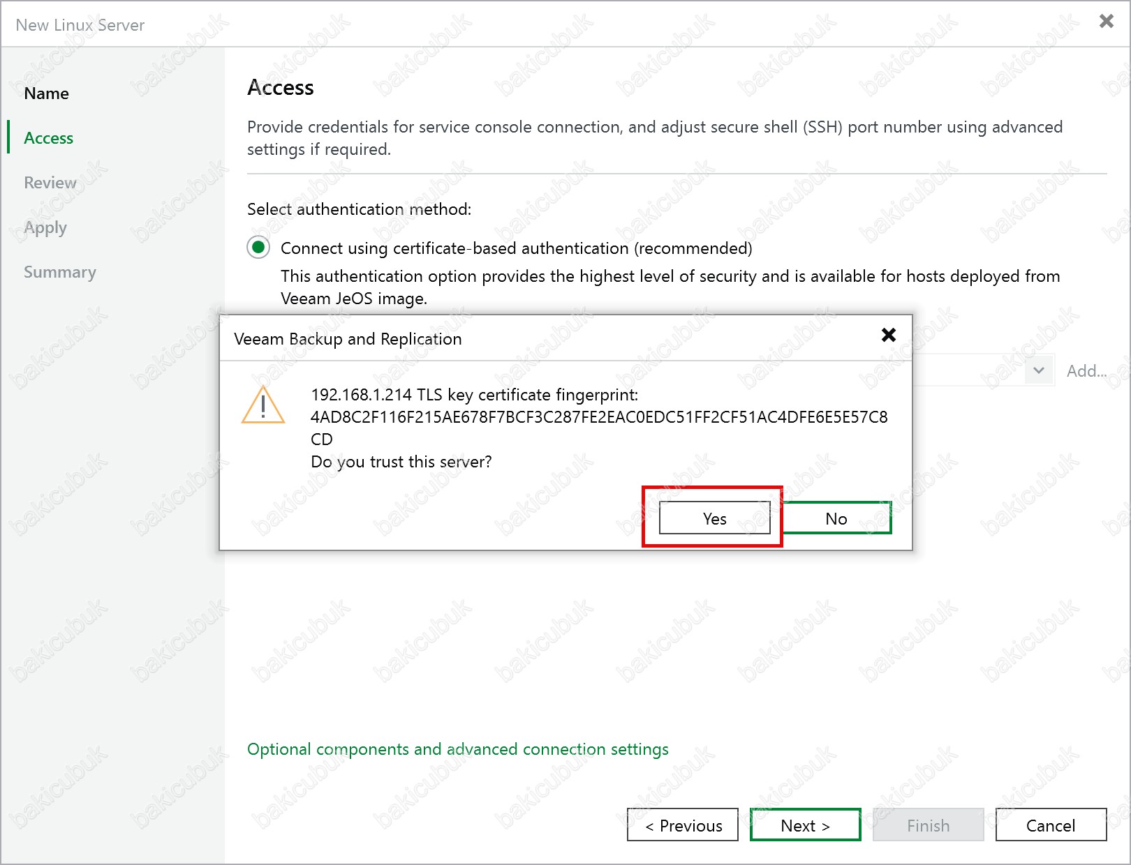 Veeam Backup and Replication ekranında Veeam JEOS 13.0.0.4967 Hardened Repository sunucumuza bağlantı sağlaması için sertifika tabanlı kimlik doğrulamasına Yes diyerek kabul ediyoruz.