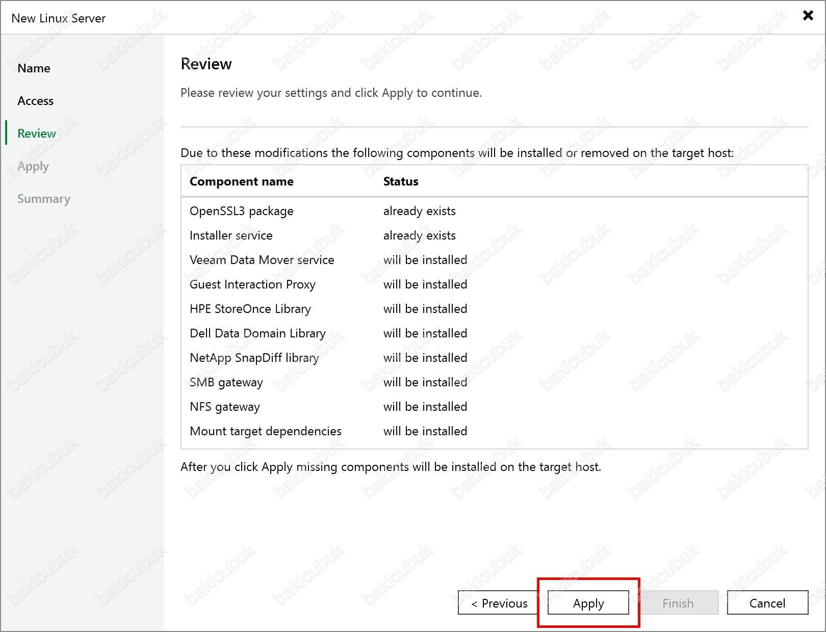 Review ekranında Apply diyerek kurulum ve yapılandırmayı başlatıyoruz.