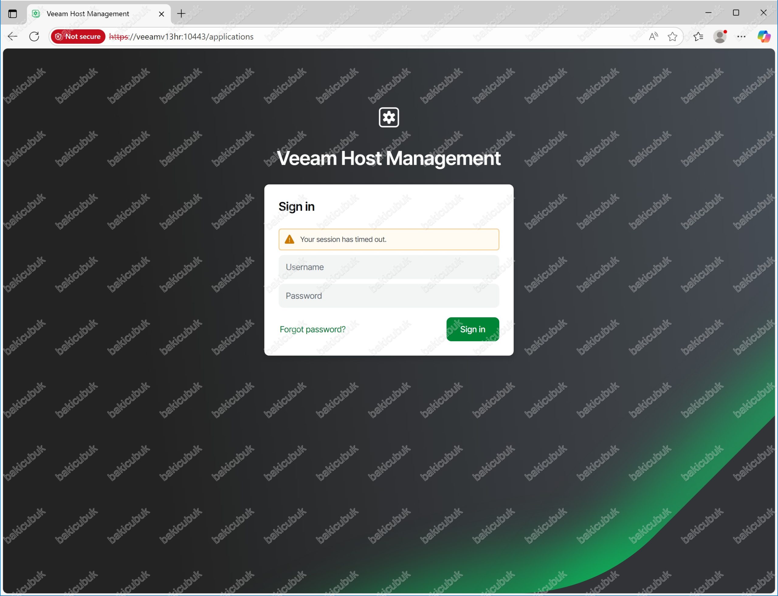 Veeam JEOS 13.0.0.4967 Hardened Repository sunucumuz üzerinde Veeam Host Management Console ekranını tekrar kontrol ediyoruz. Oturum sonlandırıldığını görüyoruz.