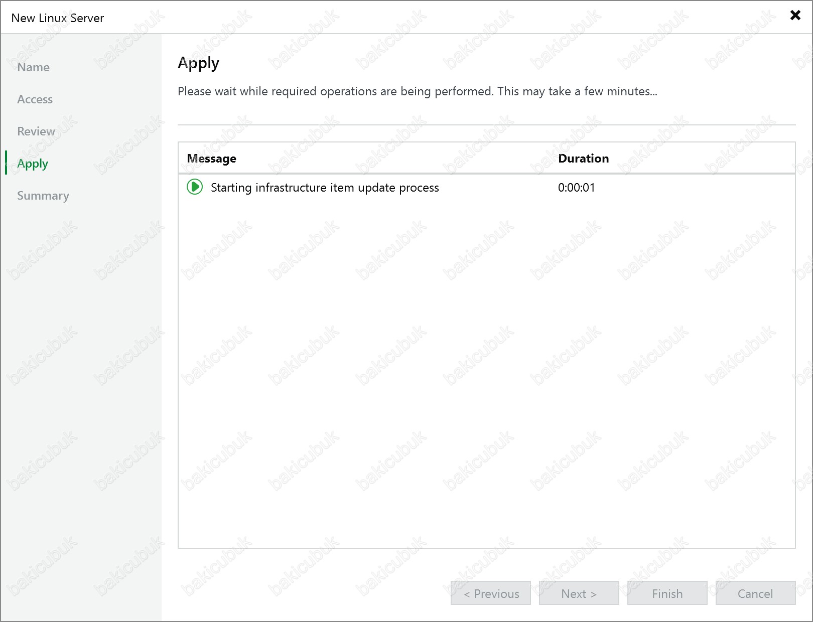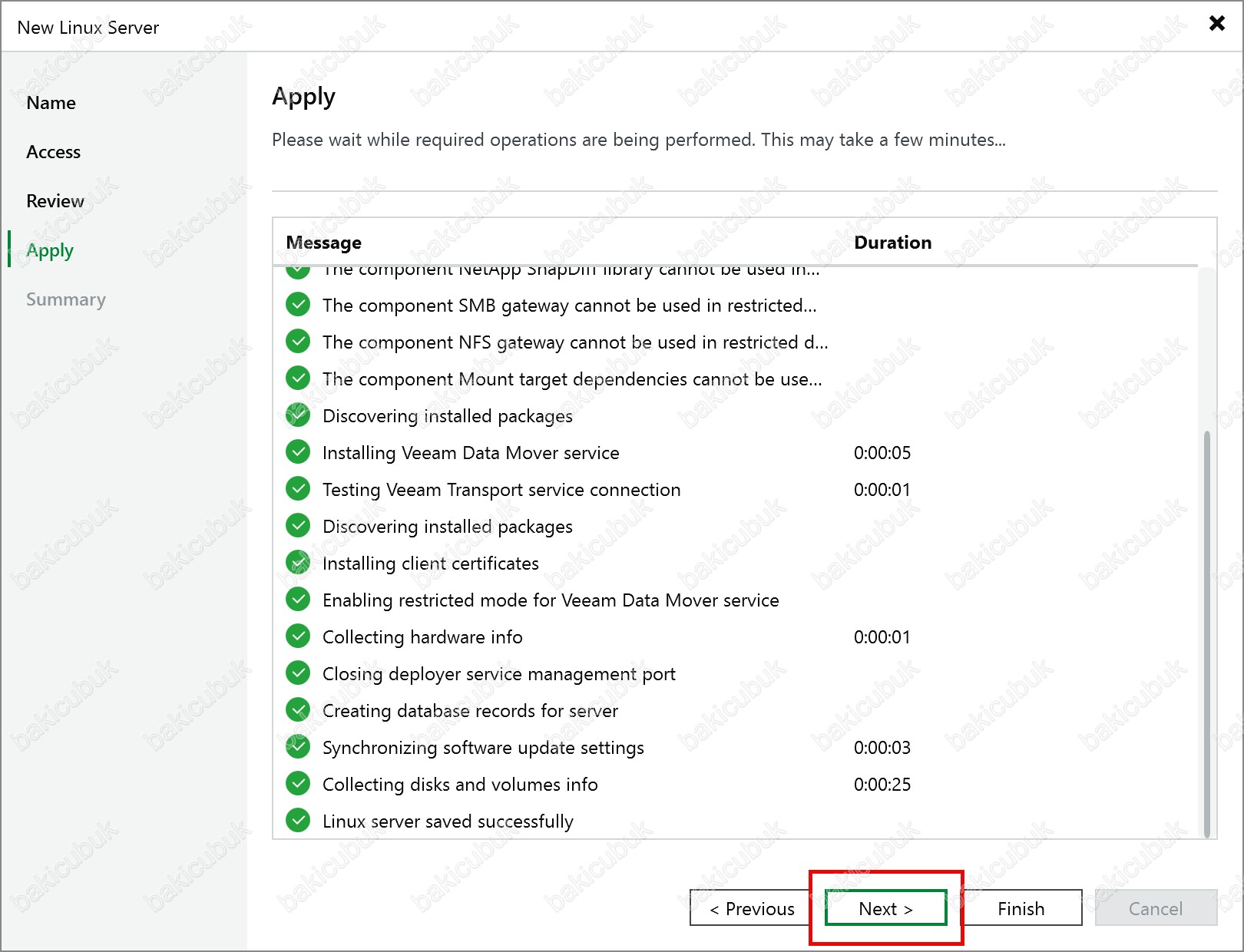 Apply ekranında Veeam JEOS 13.0.0.4967 Hardened Repository sunucumuz üzerinde Veeam Software Appliance 13.0.0.4967 bileşenlerinin kurulumu ve gerekli yapılandırma işleminin başarıyla tamamlandıktan sonra direkt olarak Finish diyerek New Linux Server ekranını kapatabilirsiniz.