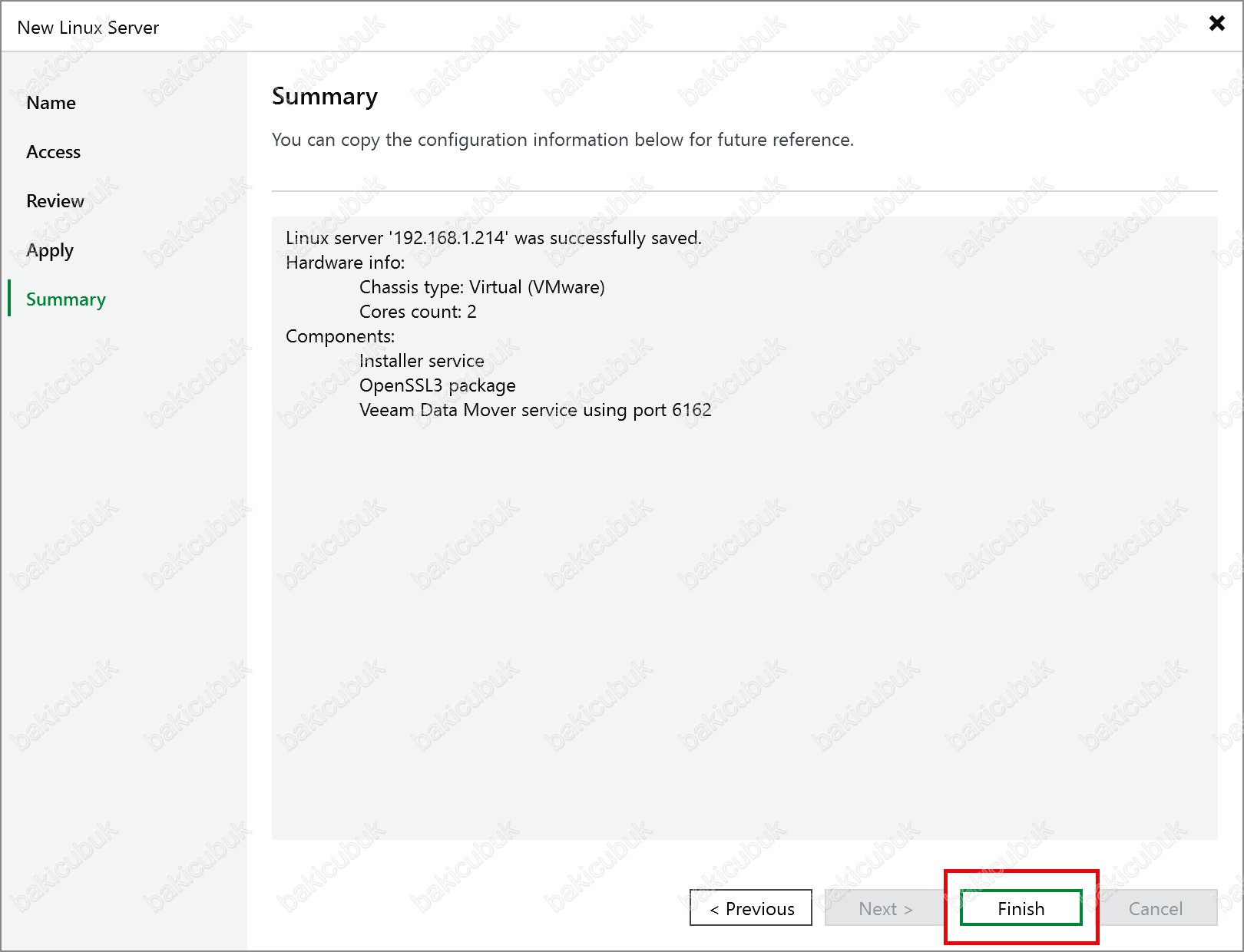 Summary ekranında gerekli yapılandırma bilgisini kontrol ettikten sonra Finish diyerek yapılandırmayı sonlandırıyoruz.