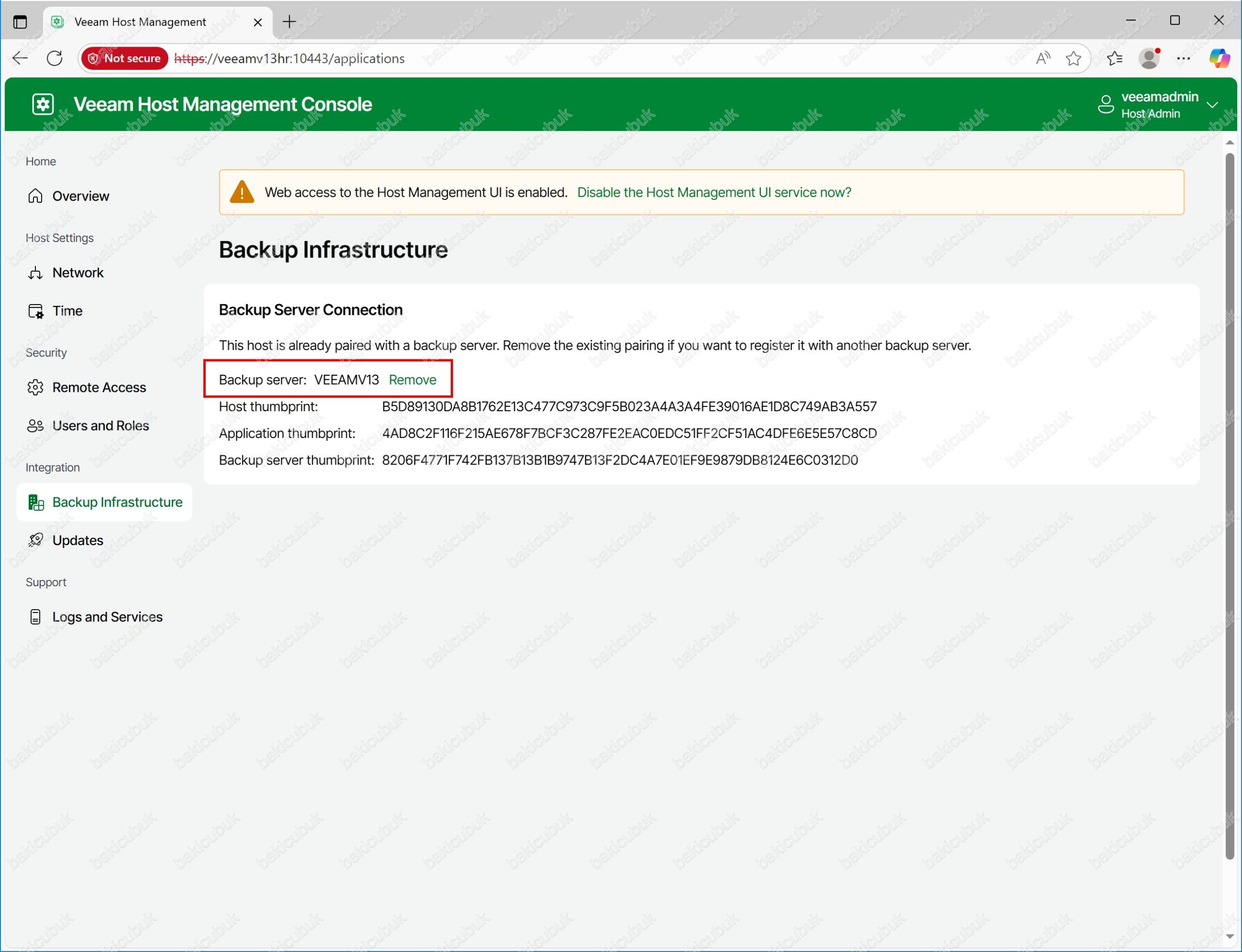 Veeam Host Management ekranında Remote access configuration seçeneği altında Disable web UI seçeneğini görüyoruz. Veeam Host Management Web UI yönetim konsoluna Enable (Etkinleştir) duruma yani erişilebilir durumdadır.