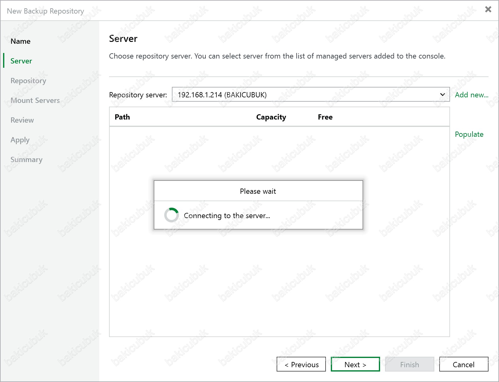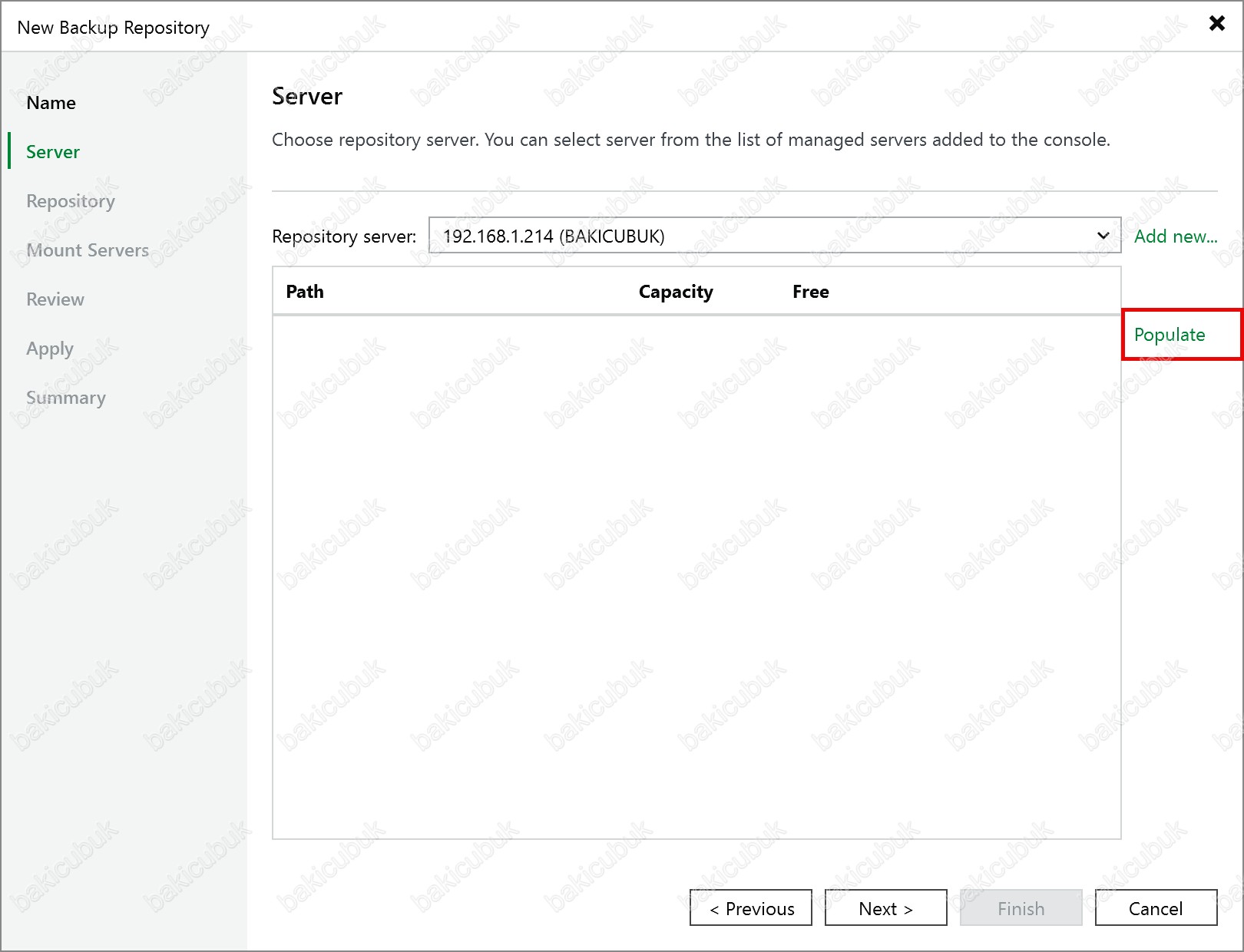 Reporsitory ekranında Populate seçeneğine tıklıyoruz ve Capacity (Kapasite) ve Free space (Boş Alan) sorgulamasını başlatıyoruz.
