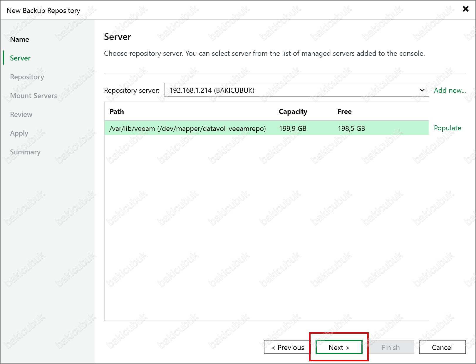 Server ekranında VEEAMV13HR isimli 192.168.1.214 IP Adresine sahip Veeam JEOS 13.0.0.4967 Hardened Repository sunucumuz üzerinde bulunan /var/lib/veeam (/dev/mapper/datavol-veeamrepo) isimli 200 GB (Gigabyte) boyutundaki Hard Disk dizinini seçiyoruz ve Next diyerek devam ediyoruz.