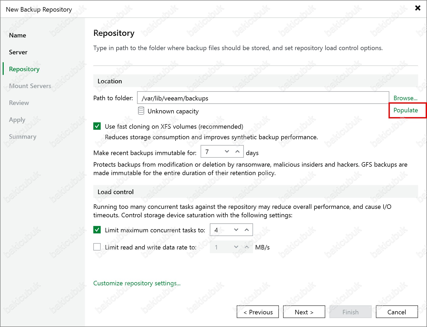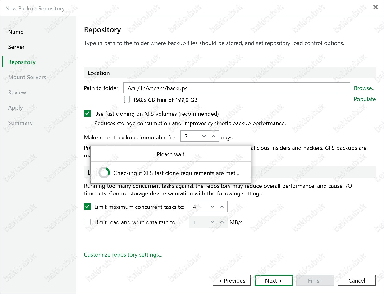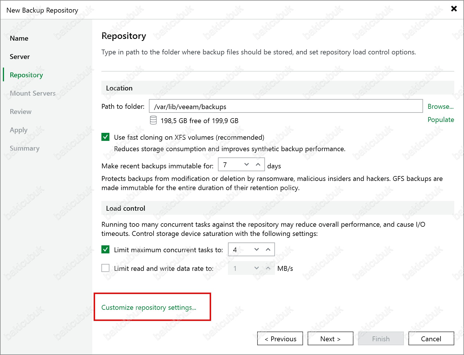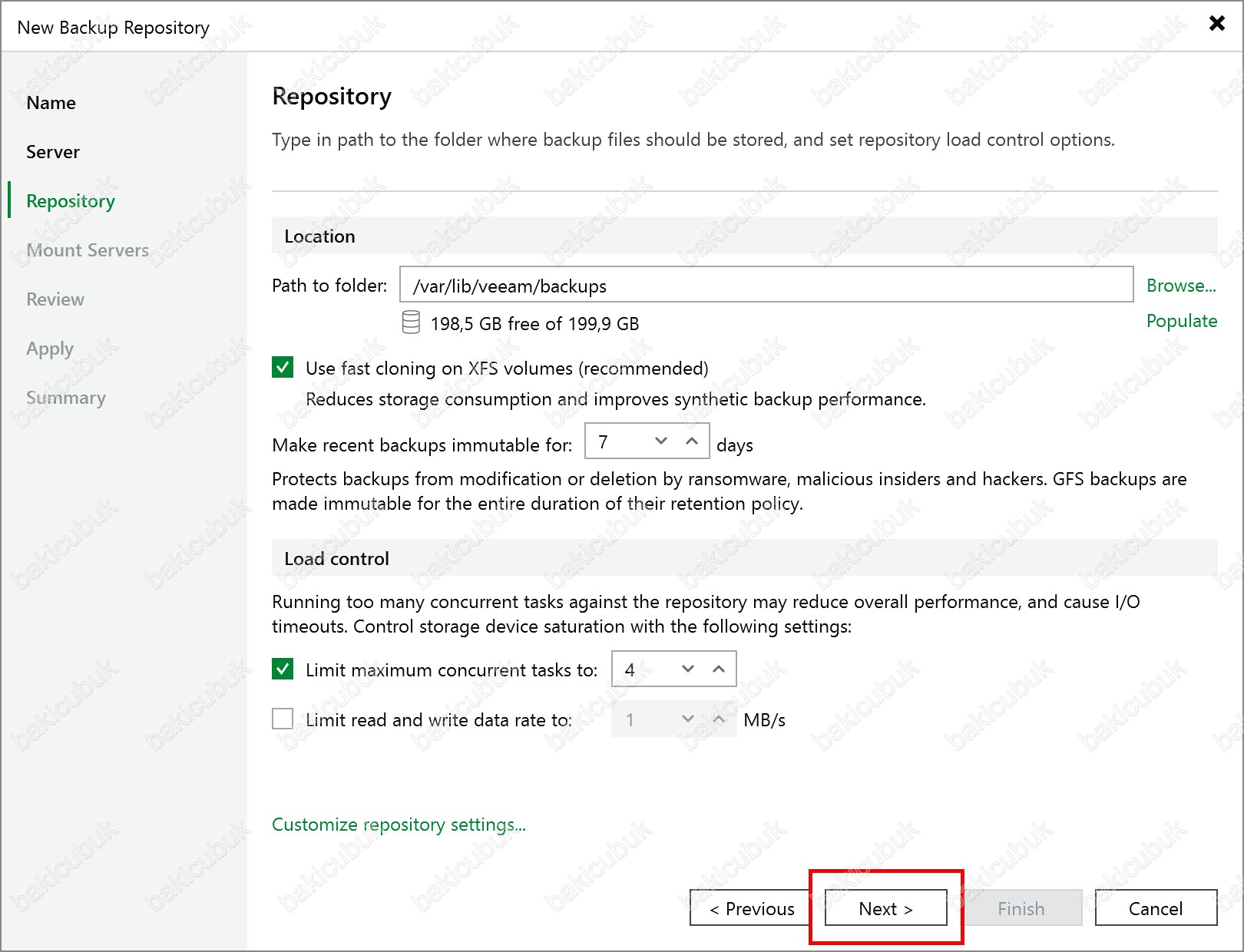 - Limit maximum concurrent task to: Bu seçenek ile oluşturacağınız Veeam JEOS 13.0.0.4967 Hardened Repository üzerinde aynı anda kaç tane Backup Job görevinin çalışacağını yapılandırabilirsiniz. Varsayılan değer olarak 4 gelmektedir.