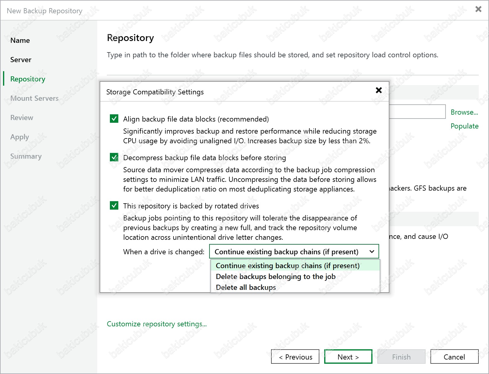 - This repository is backed by rotated drives: Bu seçenek etkinleştirildiğinde, Veeam yedekleme deposunun periyodik olarak değiştirilen taşınabilir disklerle (örn. USB, eSATA, RDX, çıkarılabilir HDD) çalıştığını bilir. Böylece Veeam, diskin takılı olup olmadığını kontrol eder ve disk yoksa bekleme / tekrar deneme mekanizmasını devreye alır. Bu yöntem genellikle offsite yedekleme için tercih edilir: Bir disk takılır → yedek alınır → disk çıkarılıp farklı bir yerde saklanır → başka bir disk takılır. Küçük/orta ölçekli işletmelerde, sürekli açık bir NAS veya deduplication appliance almak yerine dönüşümlü taşınabilir disklerle yedekleme yapılmak istendiğinde. Offline/offsite koruma sağlamak için: Diskler dönüşümlü şekilde kasada, farklı lokasyonda veya offline tutulur → ransomware ve kötü amaçlı yazılımlara karşı ekstra koruma.