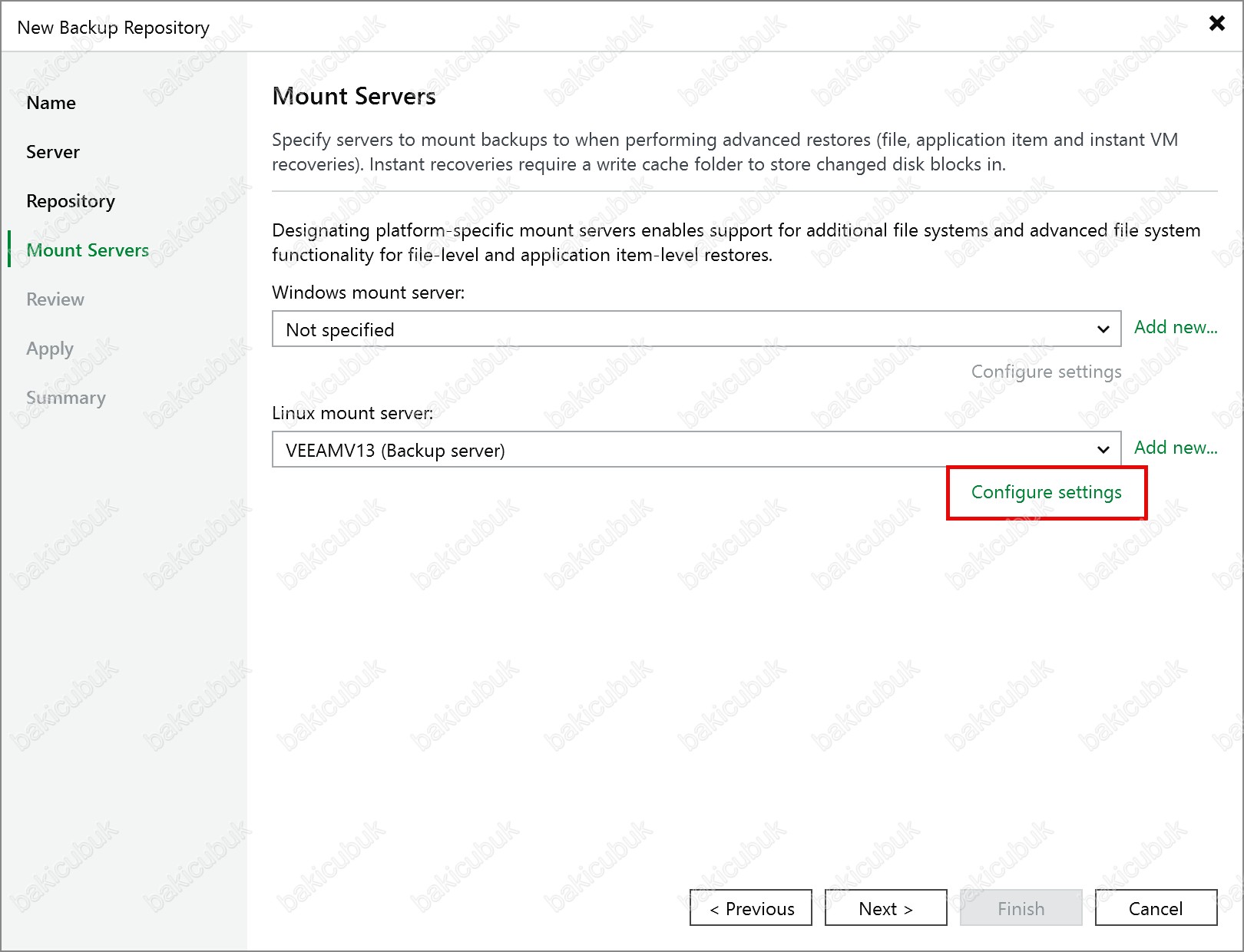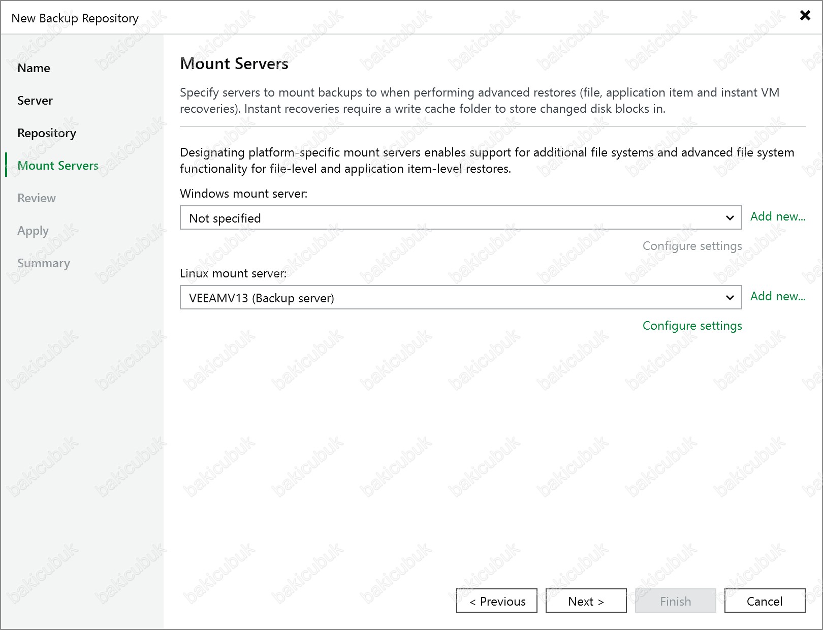 Mount Servers bölümün altında bulunan Windows mount server ve Linux mount server seçeneklerinde farklı bir Mount Server eklemek ve yapılandırmak isterseniz Add new diyerek yapılandırabilirsiniz.