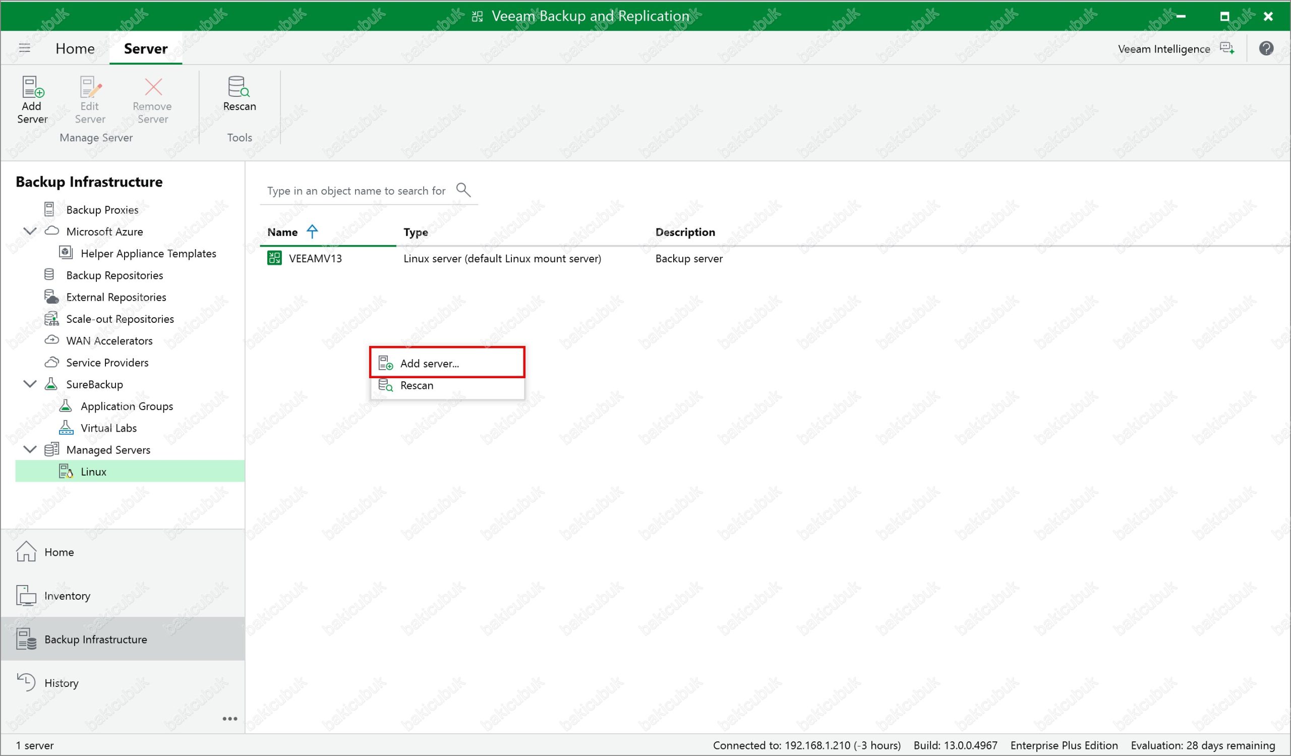 Veeam Software Appliance 13.0.0.4967 konsolu üzerinde Backup Infrastructure menüsü altında bulunan Managed Servers menüsünde Veeam JEOS 13.0.0.4967 Hardened Repository sunucumuzu eklemek için sağ tuş Add server ya da Manage Server menüsünde bulunan Add Server seçeneği ile Veeam JEOS 13.0.0.4967 Hardened Repository sunucumuzu ekleme Linux (Hardened Repository) işlemini yapılandırabilirsiniz.