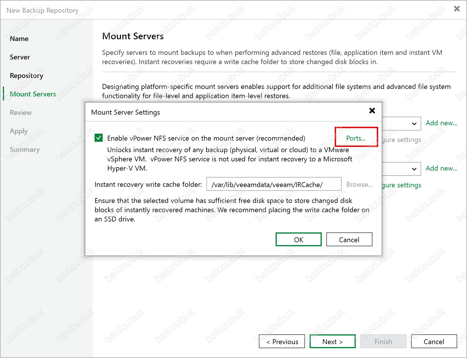 Mount Servers Settings ekranında Enable vPower NFS service on the mount server (recommended) bölümünün yanında bulunan Ports seçeneğine tıklıyoruz.