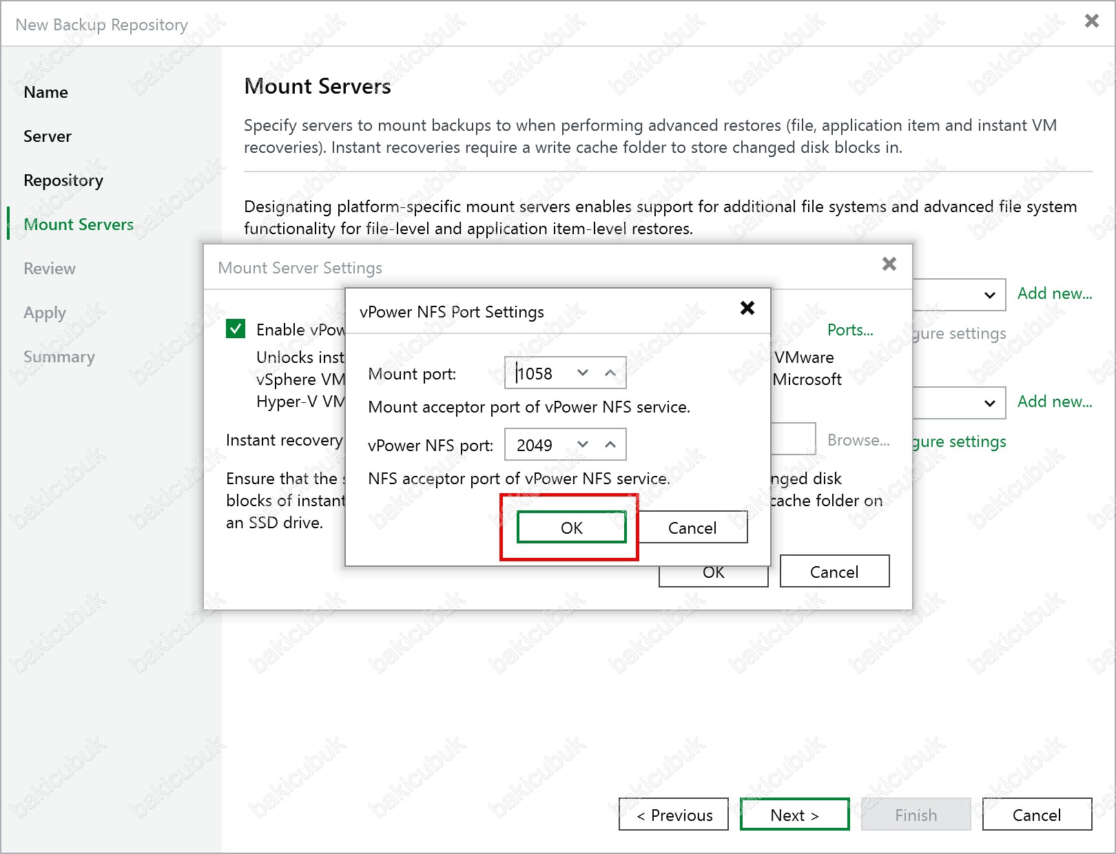 vPower NFS Port Settings ekranında varsayılan yapılandırmada herhangi değişiklik yapmıyoruz ve OK diyerek devam ediyoruz.