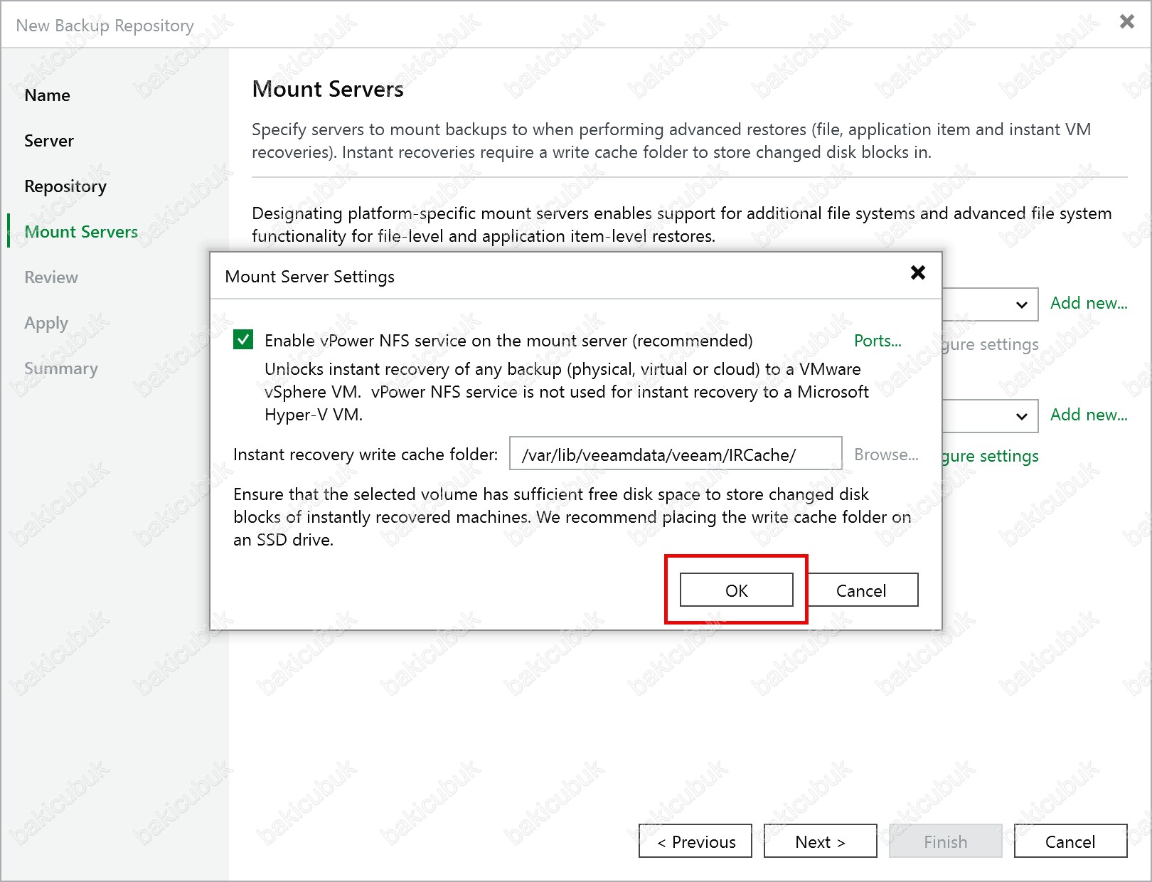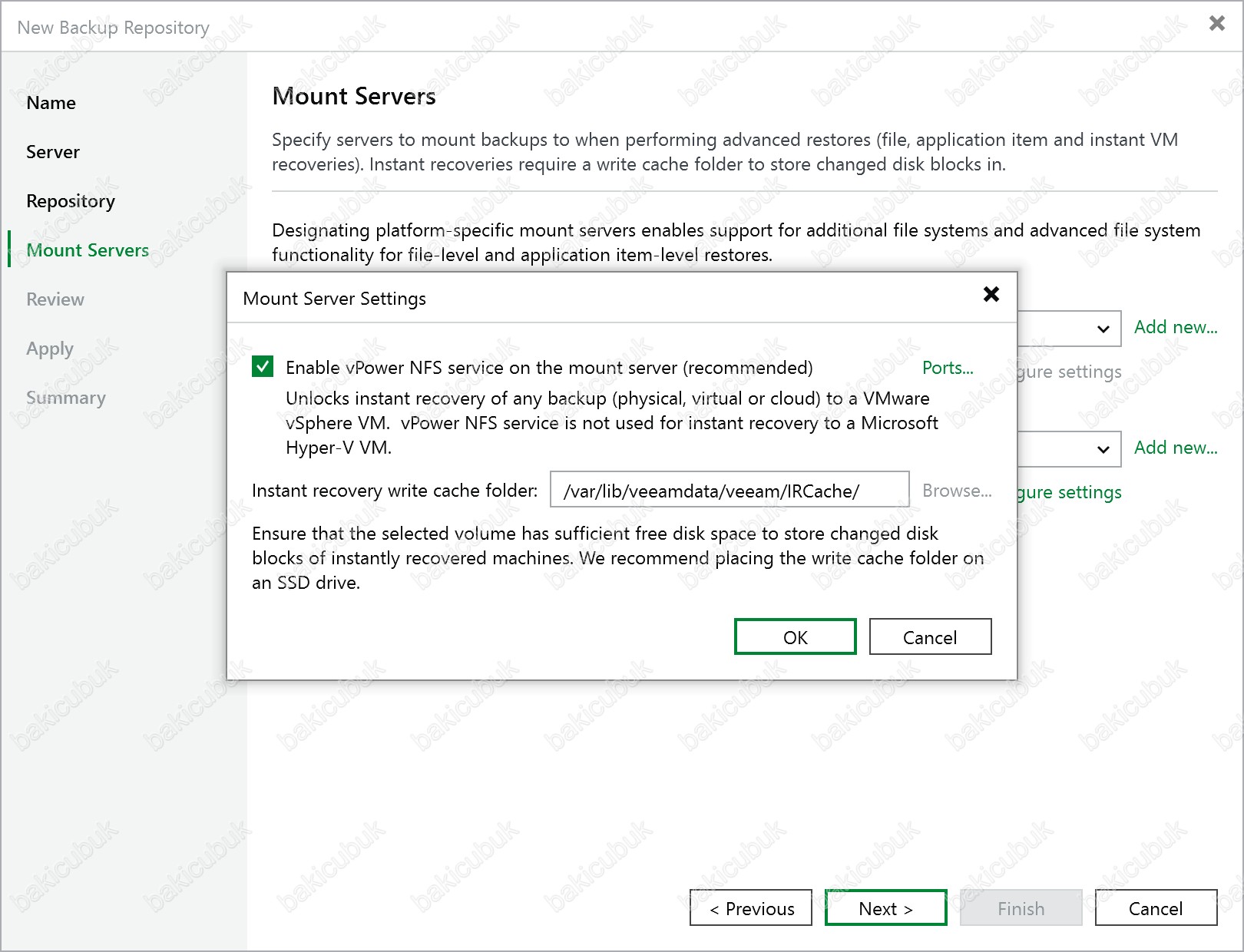 Enable vPower NFS service on the mount server (recommended): Bu seçenek etkinleştirildiğinde, vPower NFS servisi mount server üzerinde çalıştırılır. vPower NFS, Veeam’in yedek dosyalarını (VBK, VIB vb.) NFS paylaşımı olarak sunmasını sağlayan teknolojidir. Böylece sanal makineler, yedek dosyalarının içerisindeki disklerden doğrudan çalıştırılabilir.
