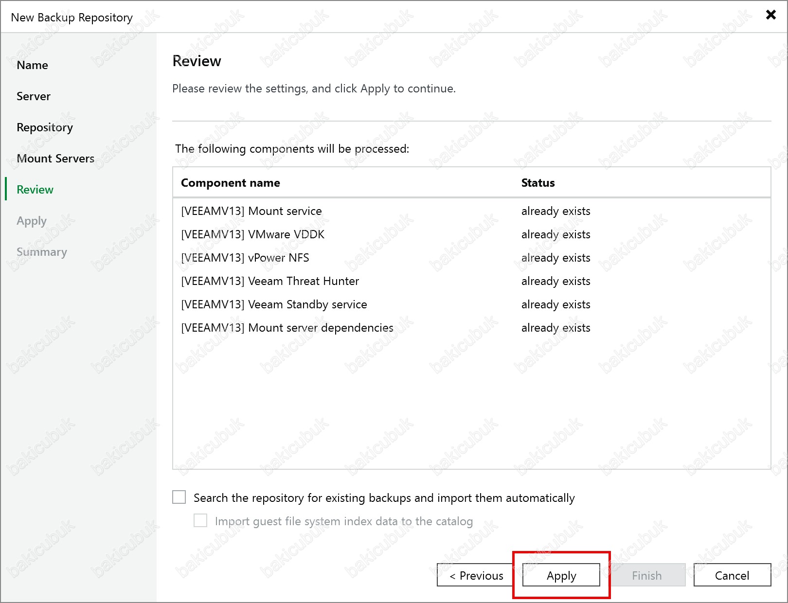 - Search the repository for existing backups and import them automatically: Bu seçenek etkinleştirildiğinde, Veeam Software Appliance 13 repository üzerinde daha önce oluşturulmuş yedek dosyalarını (VBK, VIB, VRB vb.) otomatik olarak tarar. Bulunan yedekler, Backup job’larına bağlı olmasa bile Veeam Database’e (configuration DB) import edilir. Böylece, önceden oluşturulmuş yedekler manuel import işlemi yapmaya gerek kalmadan Veeam Software Appliance 13 arayüzünde görünür. Yeni bir Veeam Software Appliance 13 kurulumu yapıldığında → eski Backup Repository yedeklerin otomatik tanınması için. Bir Backup Job silinip tekrar oluşturulduğunda → eski yedeklerin devam ettirilmesi için. Harici veya taşınabilir bir Backup Repository (Örneğin USB Hard Disk, Rotated Drives) takıldığında → yedeklerin otomatik görünmesi için.