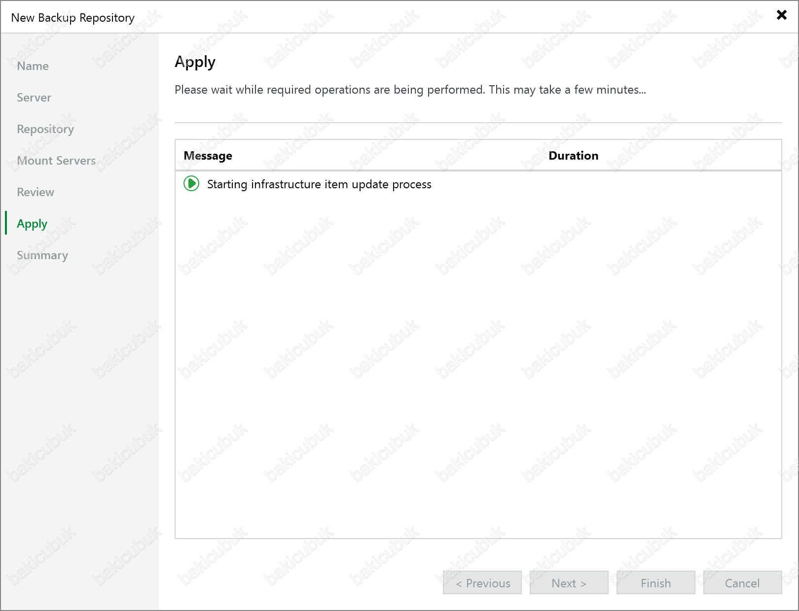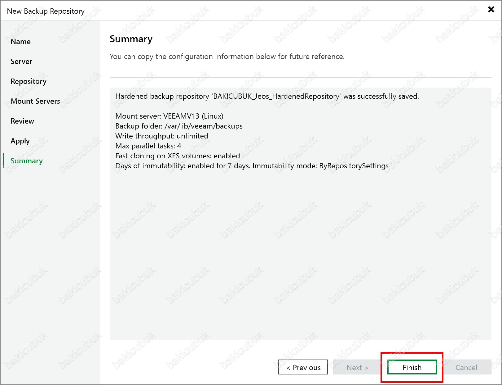 Apply ekranında Veeam JEOS 13.0.0.4967 Hardened Repository sunucumuz üzerinde Veeam Software Appliance 13.0.0.4967 bileşenlerinin kurulumu ve gerekli yapılandırma işleminin başarıyla tamamlandıktan sonra direkt olarak Finish diyerek New Backup Repository ekranın kapatabilirsiniz.