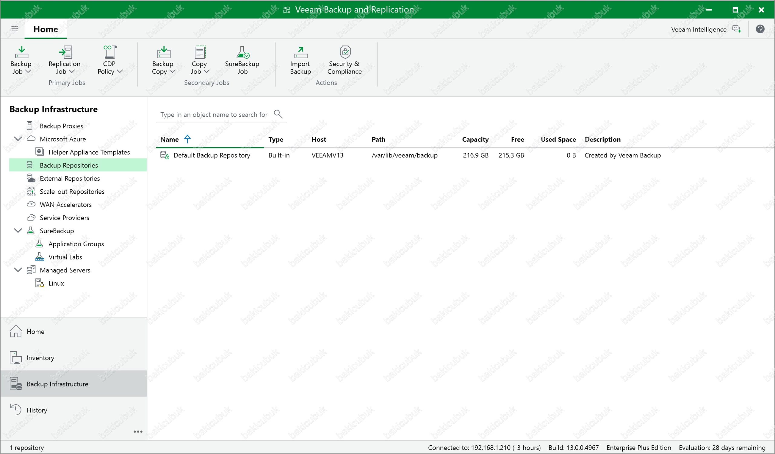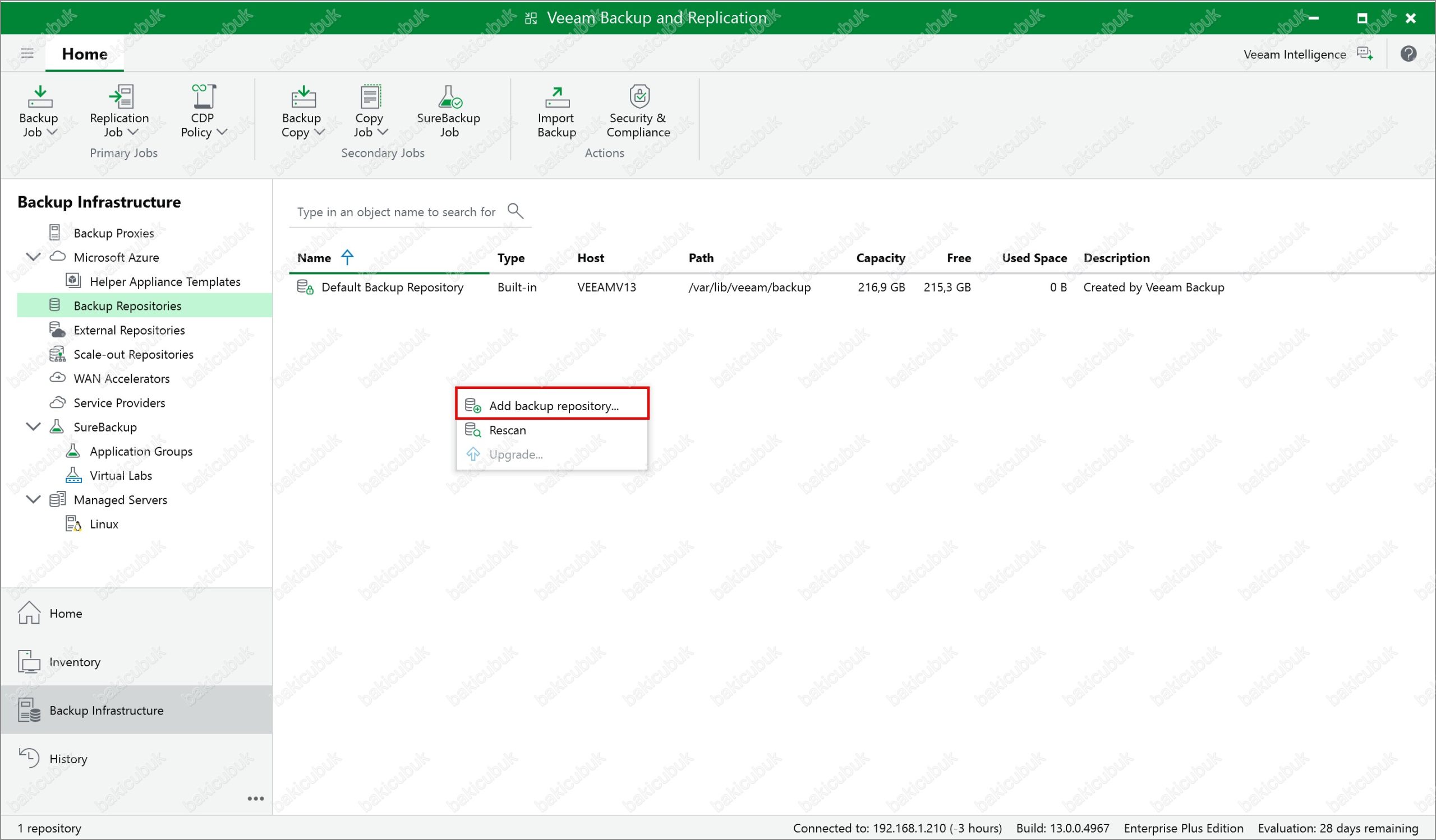 Server ekranında Repository server bölümünde VEEAMV13 isimli 192.168.1.210 IP Adresine sahip Veeam Software Appliance 13.0.0.4967 sunucumuzu görüyoruz.