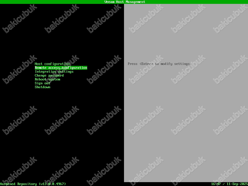 Veeam JEOS 13.0.0.4967 Hardened Repository sunucumuz üzerinde Veeam Host Management Console ekranını açıyoruz.