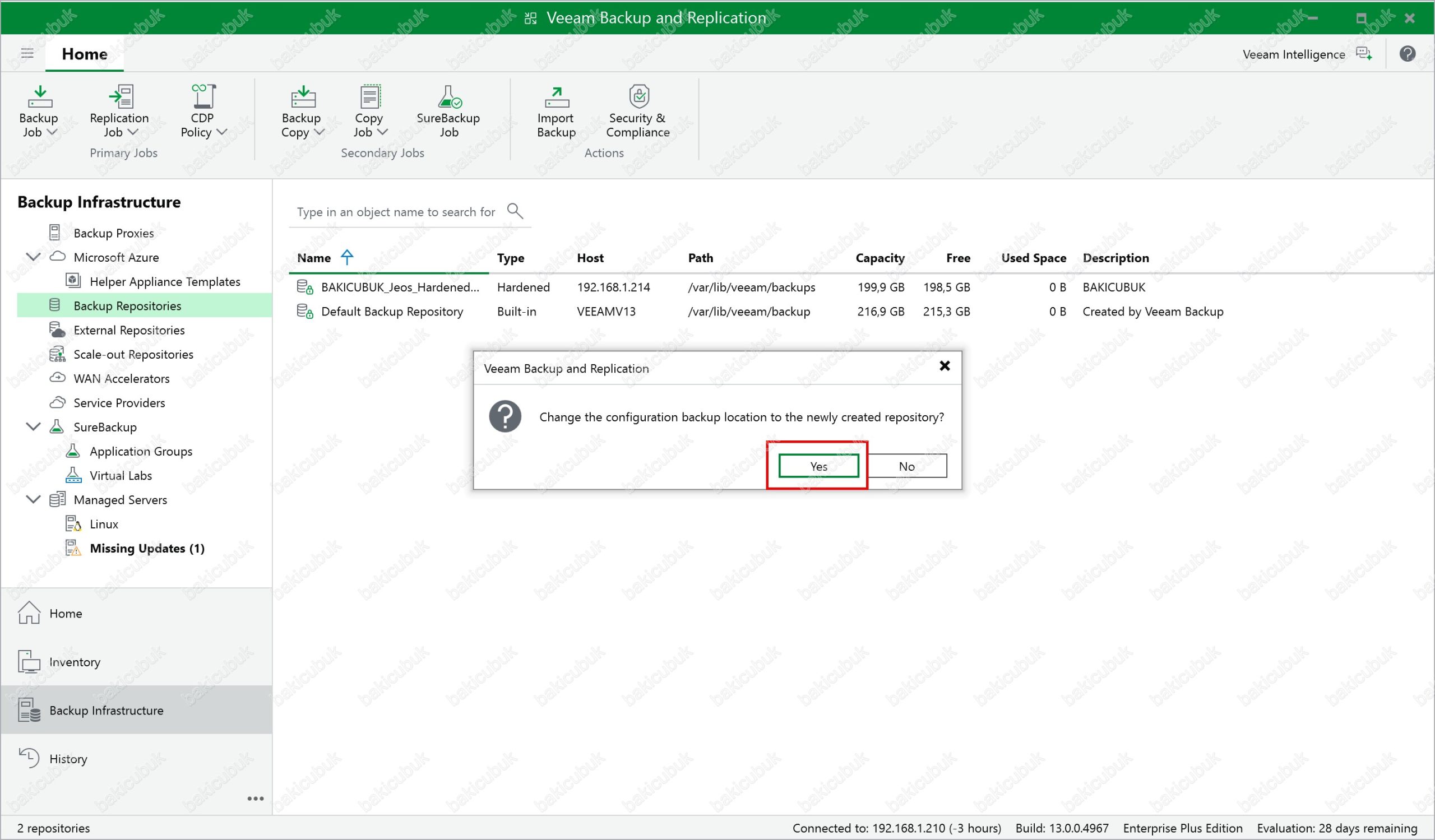 Veeam Backup and Replication ekranında Veeam Software Appliance 13.0.0.4967 sunucumuz üzerine Veeam JEOS 13.0.0.4967 Hardened Repository sunucumuz eklendiği için Change the configuration backup location to the newly created repository uyarısını görüyoruz.