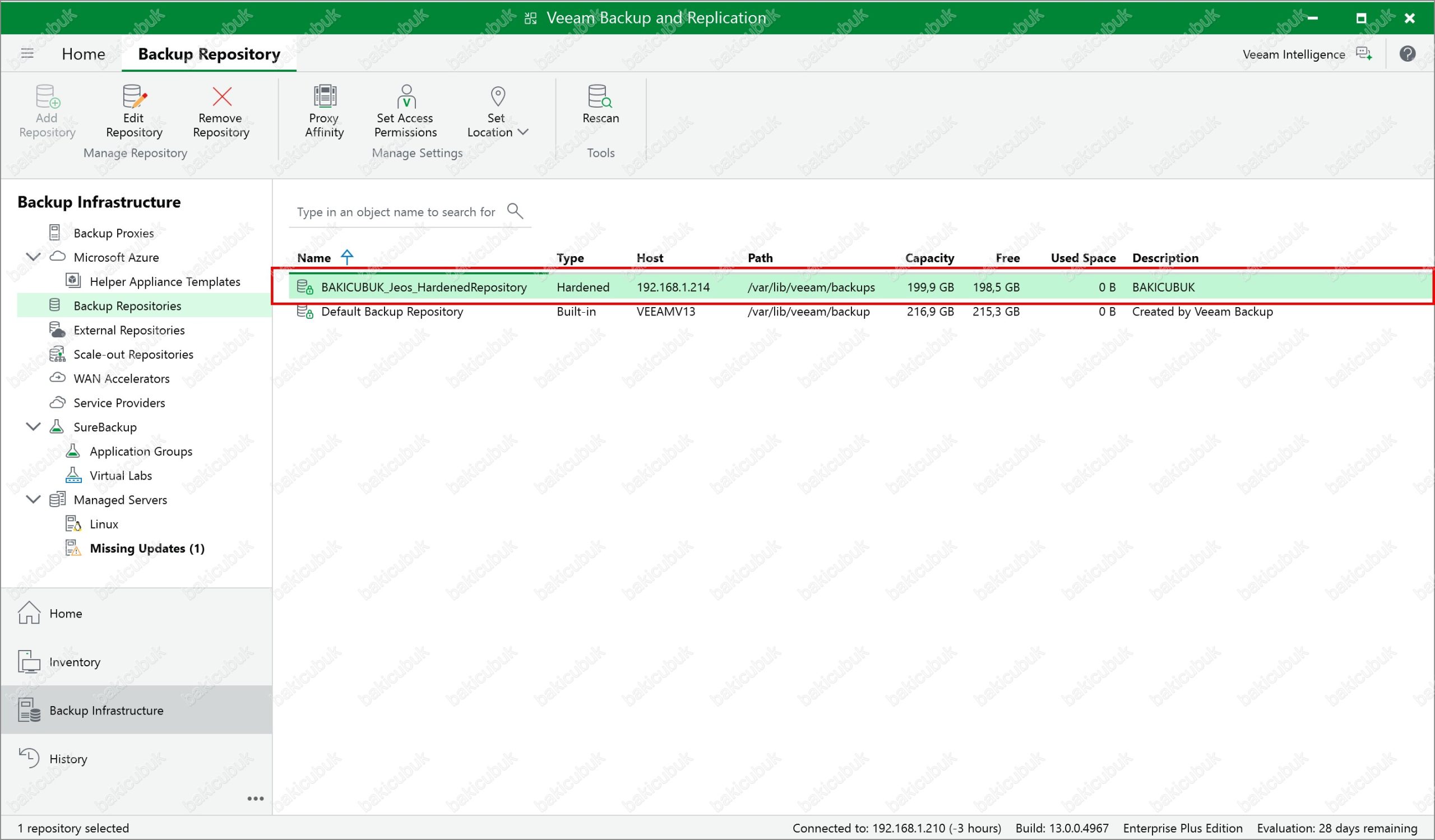 Veeam Software Appliance 13 konsolu üzerinde Backup Infrastructure menüsü altında bulunan Backup Repositories menüsünde VEEAMV13HR isimli 192.168.1.214 IP Adresine sahip Veeam JEOS 13.0.0.4967 Hardened Repository sunucumuzun BAKICUBUK_Jeos_HardenedRepository ismi ile Hardened Repository (Immutability) yapılandırmasını görüyoruz.
