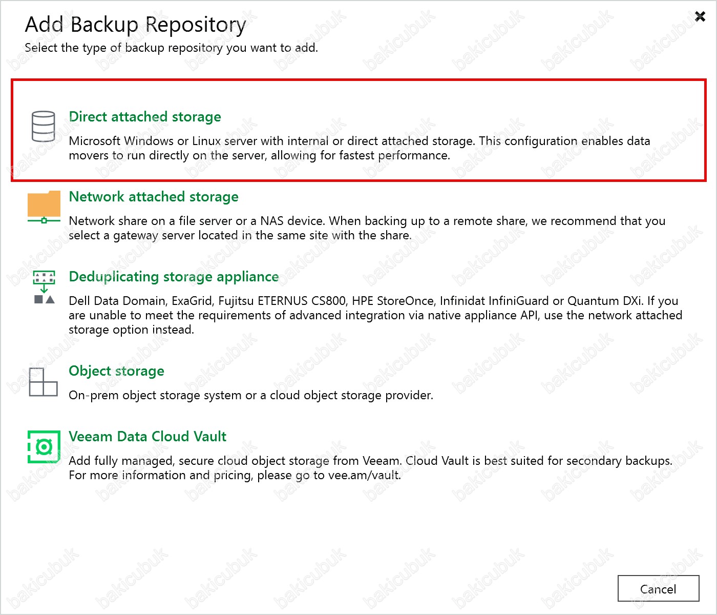 Add Backup Repository ekranında Direct attached storage seçeneğini seçerek devam ediyoruz.