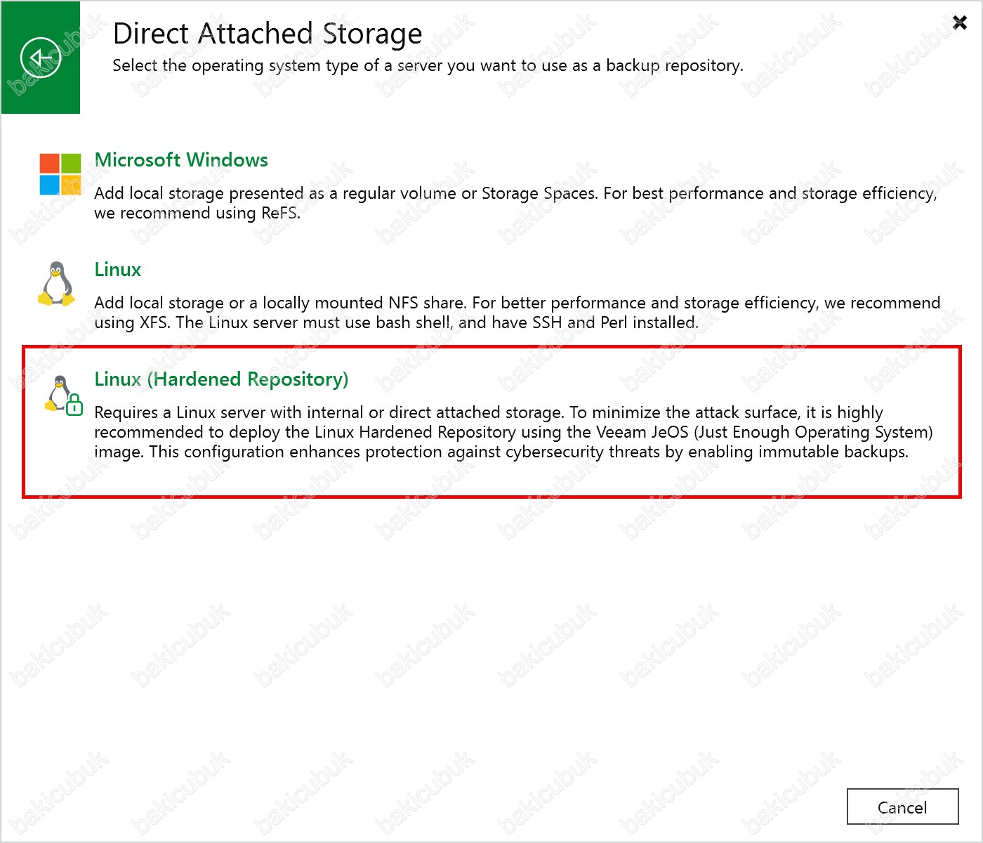 Linux (Hardened Repository) seçeneği Veeam Backup & Replication 12 ile birlikte gelen bir özellikti.