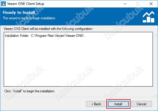 Ready to Install ekranın da Veeam ONE Client 11a kurulumu ve yapılandırma için yapmış olduğumuz yapılandırma özetini görüyoruz.