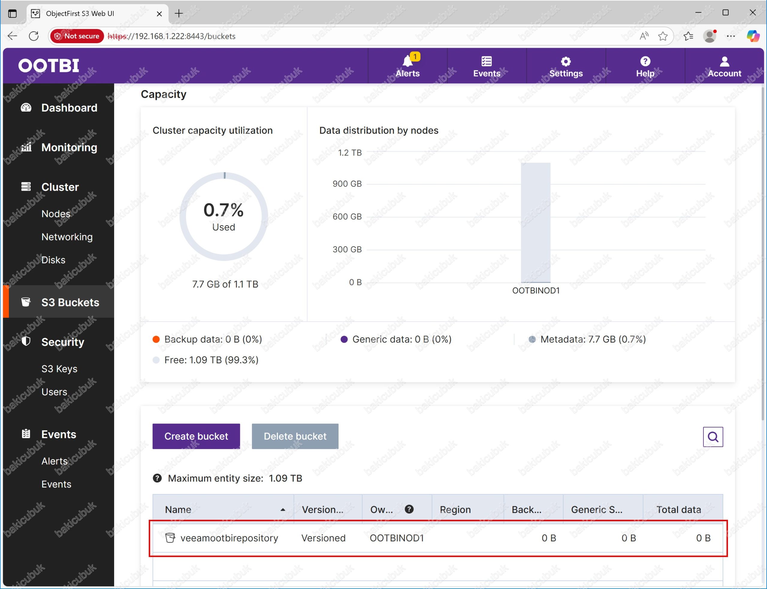 S3 Buckets ekranında Object First OOTBI sunucumuz üzerinde veeamootbirepository isimli S3 Bucket yapısının oluşturulduğunu görüyoruz.