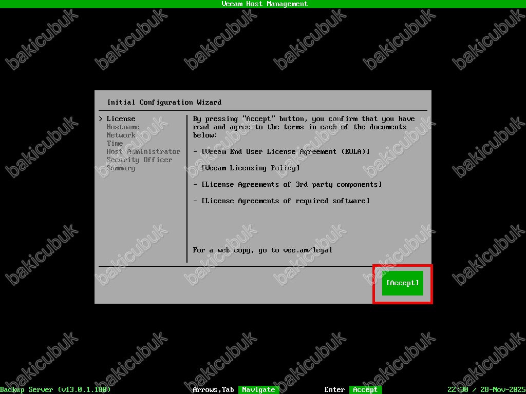 Kurulum önkoşulları sağlandıktan ve sunucu ilk kez başlatıldıktan sonra karşınıza Veeam Software Appliance 13.0.1.180 kurulum ekranı gelir.